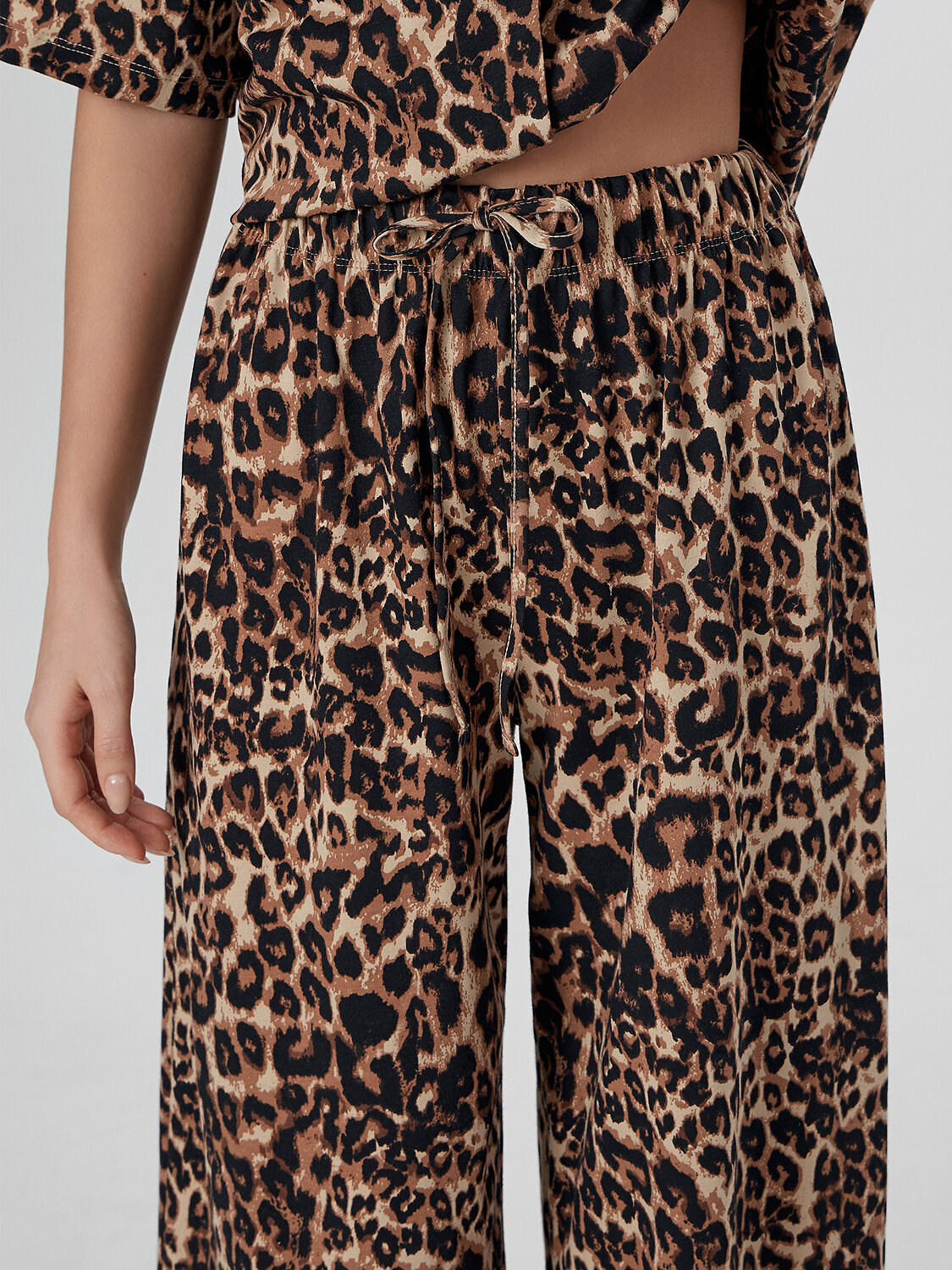 Брюки с эластичной резинкой мягко сидят по талии, не сковывая движений. Оригинальный пояс с протянутой декоративной тесьмой добавляет модели изюминку, а аккуратно обработанные низы сохраняют форму изделия.