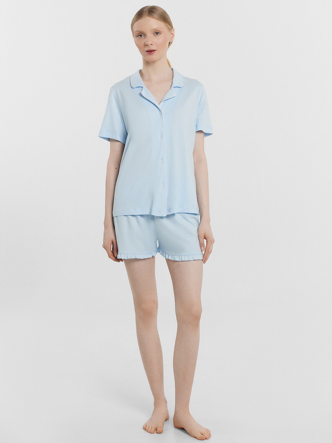 Красивая пижама женская из высококачественного хлопка актуального свободного силуэта, модель выполнена в однотонном цвете с рисунком в виде горошка. Горловина жакета оформлена отложным воротником с лацканами. По краю воротника атласный кант. Рукав короткий. Жакет с центральной застежкой с петлями и пуговицами. Шорты свободного силуэта, низ шорт обработан с отрезными рюшами. В ней абсолютно не жарко, комфортная легкая слегка тянущаяся ткань не сковывает движений. Красивая и интересная модель на каждый день. В линейке много цветов и широкий размерный ряд. Такая пижама женская отлично подойдет для сна и домашних дел. Если вы в поиске нескучного комплекта, модель вас однозначно порадует. Выглядеть стильно и модно дома - это реально. Купите пижаму женскую от Mark Formelle для уютных вечеров и сладких снов!