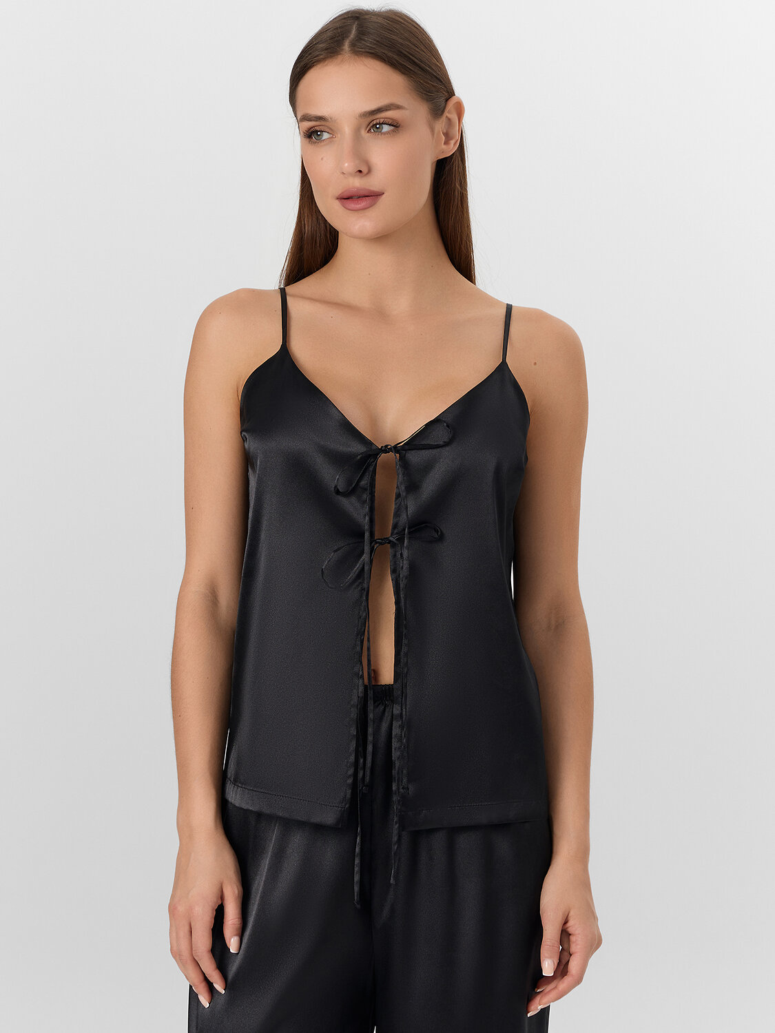 Блуза на тонких регулируемых бретелях отличается свободным прямым кроем, который мягко скользит по фигуре. Аккуратная обработка верха и эластичные сборки обеспечивают идеальную посадку. Декоративные завязки по переду добавляют элемент нежности и позволяют регулировать степень прилегания под ваш вкус.