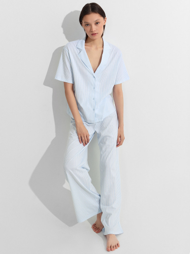 Домашний комплект подарит вам ощущение невесомого комфорта и безупречного стиля. Этот элегантный ансамбль состоит из блузы и брюк, создающих гармоничный образ для расслабленного отдыха.