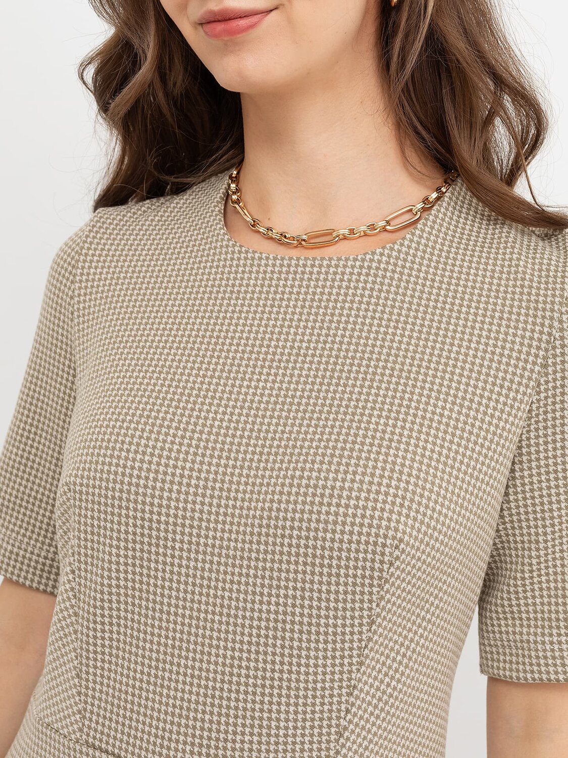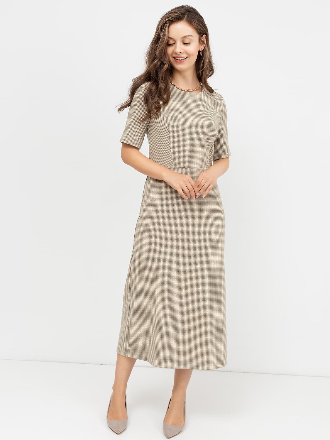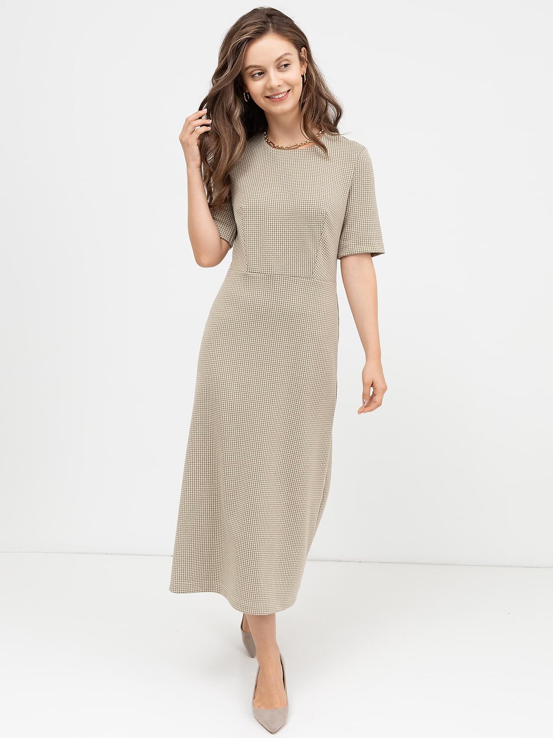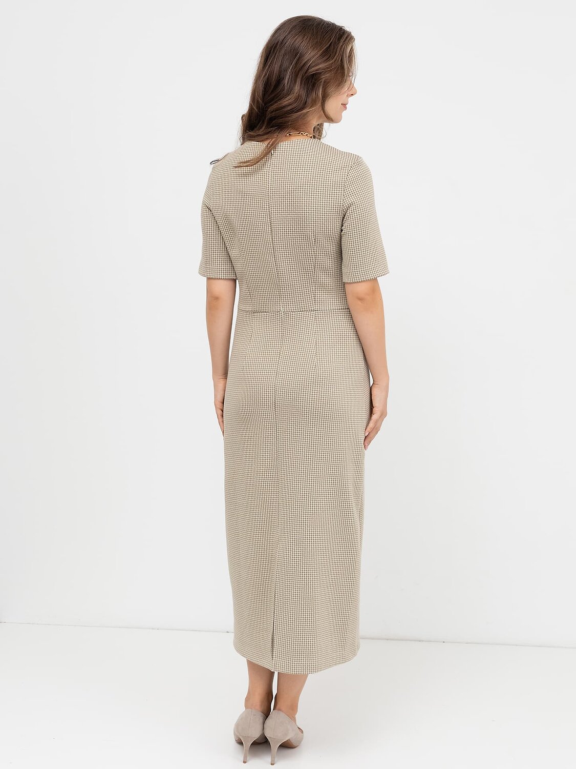 Низ платья А-силуэта, с вытачками на задней детали. Длина ниже колена.