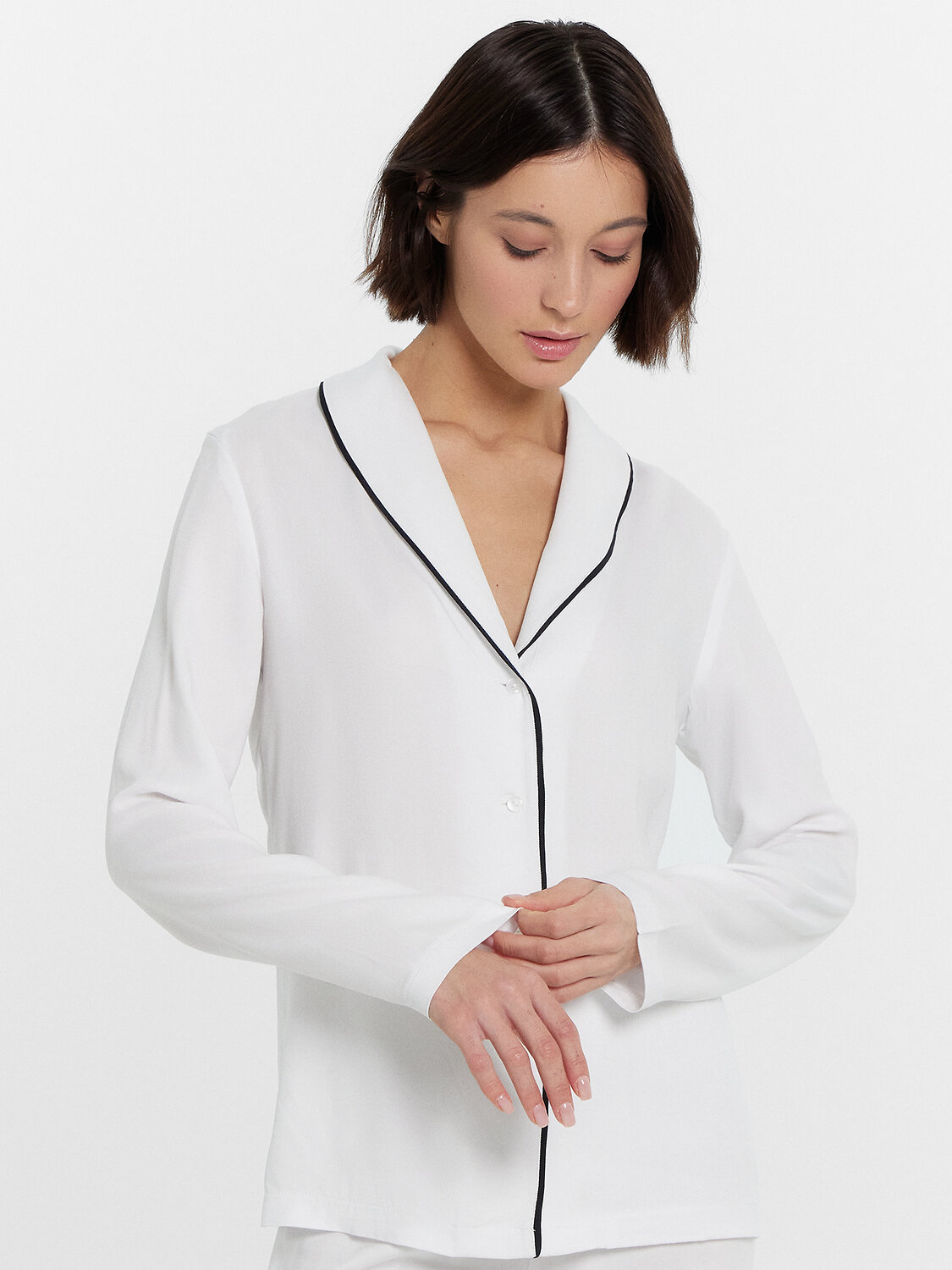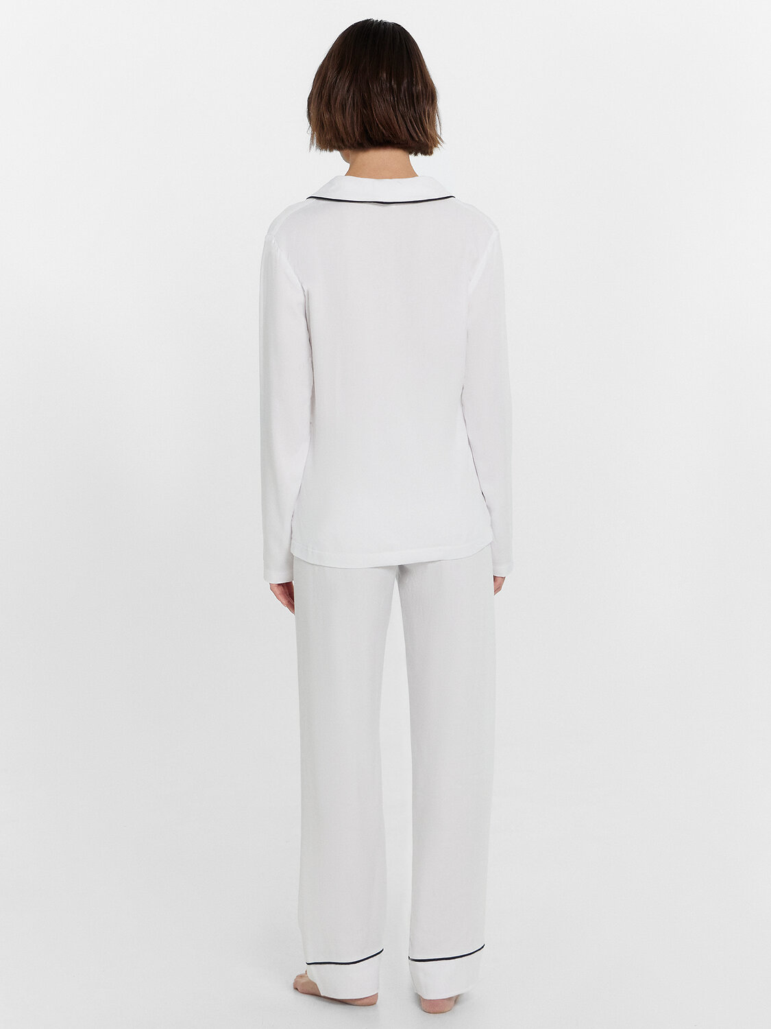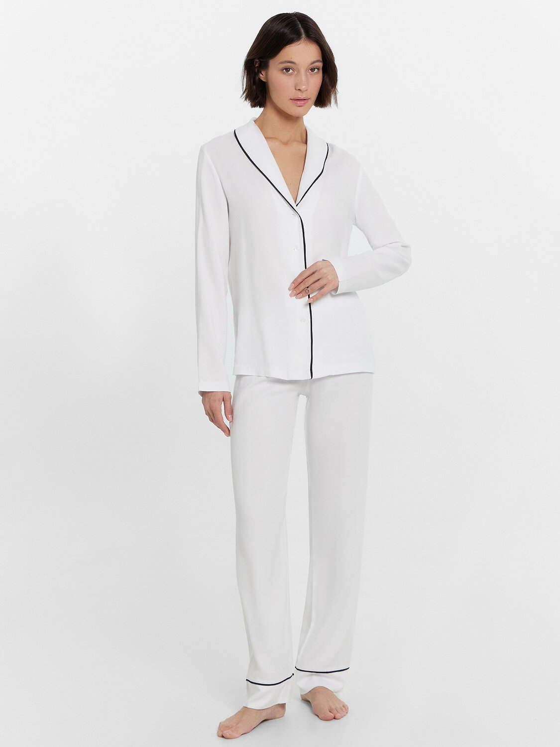 Пижамный комплект из жакета и брюк, выполненных из вискозного трикотажа. Жакет длиной до середины ягодиц, прямого силуэта, с V-образной горловиной, длинными рукавами на манжетах и немного спущенной линией плеча. По центру жакет застегивается на пуговицы. Брюки длинные, свободные, на манжетах и с эластичной резиной в поясе. Так выглядит комфорт!