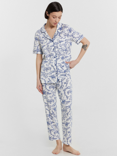 Комфортная пижама женская в "костюмном стиле" из высококачественного материала для приятных снов и домашних дел. Рубашка прямая, с отложным воротником, длинными комфортными рукавами, застегивается на пуговицы. Дополняют ее легкие брюки с посадкой на талии свободного силуэта. Пояс цельнокроеный с тесьмой эластичной внутри. В пижаме абсолютно не жарко, комфортный материал не сковывает движений. Красивая и интересная модель на каждый день. Такую пижаму можно использовать как комплект одежды для дома и отдыха, или как пижаму для сна. В линейке много интересных расцветок, широкий размерный ряд, есть актуальные варианты для девушек с пышными формами plus-size. Купить пижаму женскую недорого можно у нас на сайте и в магазинах. Лучший выбор домашней одежды на каждый день от Mark Formelle. Рекомендуем!