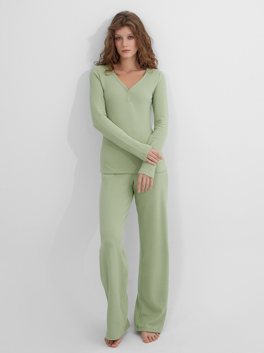 Домашняя пижама для женщин, состоящая из джемпера и брюк, создает гармоничный образ для уютного отдыха. Приталенный джемпер с изящным V-образным вырезом мягко подчеркивает силуэт, а длинные рукава обеспечивают комфорт. Элегантную деталь добавляет застежка на кнопки по переду, которая не только функциональна, но и становится стильным акцентом.