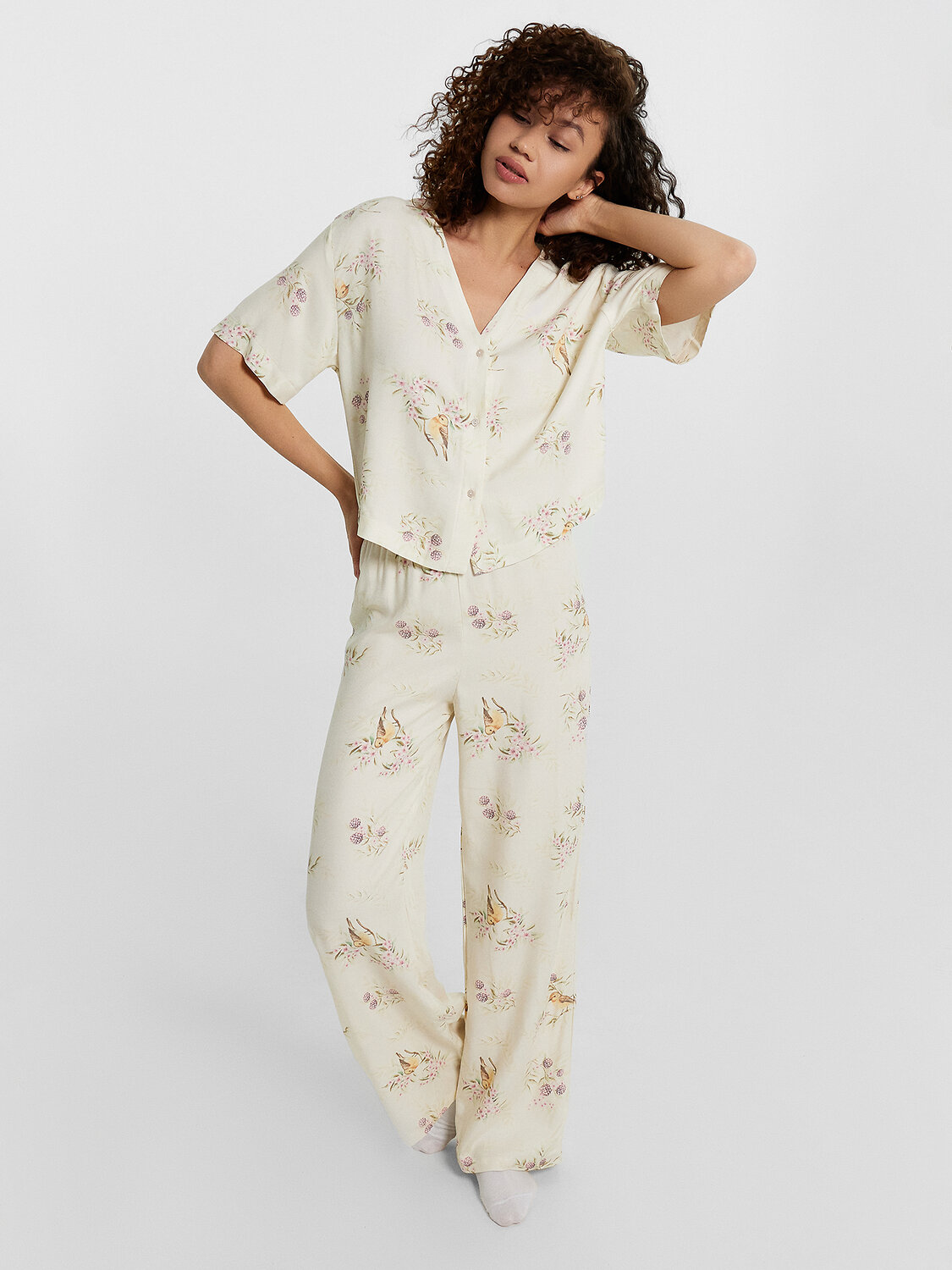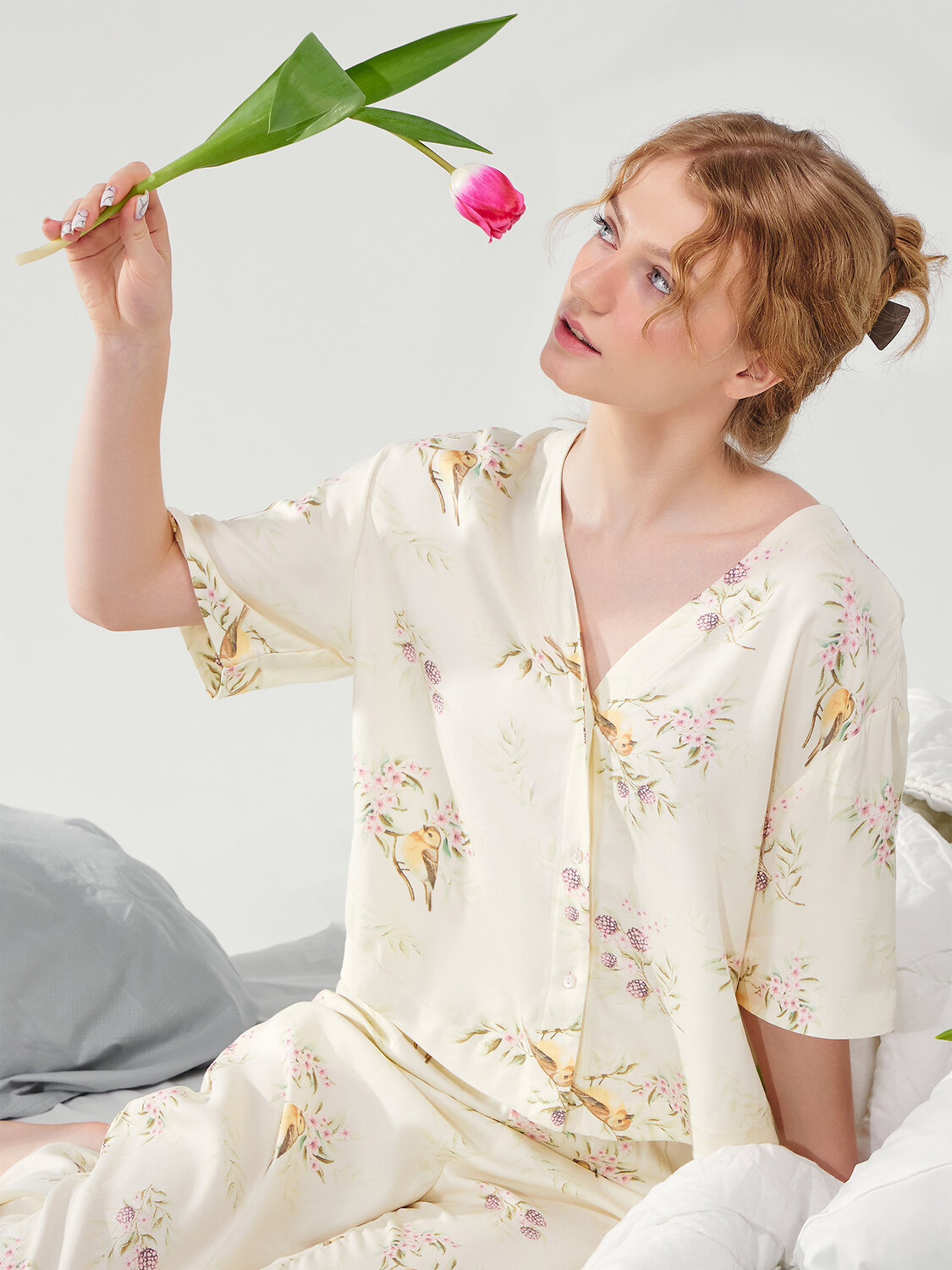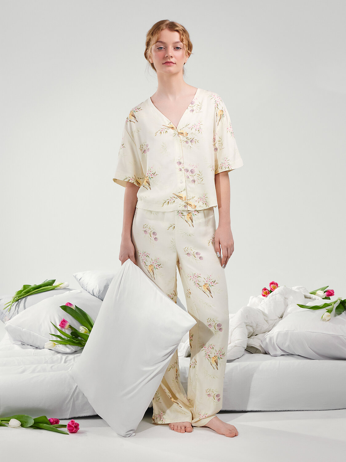 Нежная женская пижама выглядит очень элегантно и комфортно. Жакет свободного силуэта с короткими рукавами и застежкой на пуговицах создаёт легкий и расслабленный образ. А легкие брюки с эластичным поясом обеспечивают дополнительный комфорт и свободу движений. Изделие выполнено из нежнейшей и приятной к телу вискозы, которая дарит ощущение мягкости и комфорта на протяжении всего дня или ночи. Этот комплект идеален для тех, кто ценит качество и утонченность в домашней одежде.