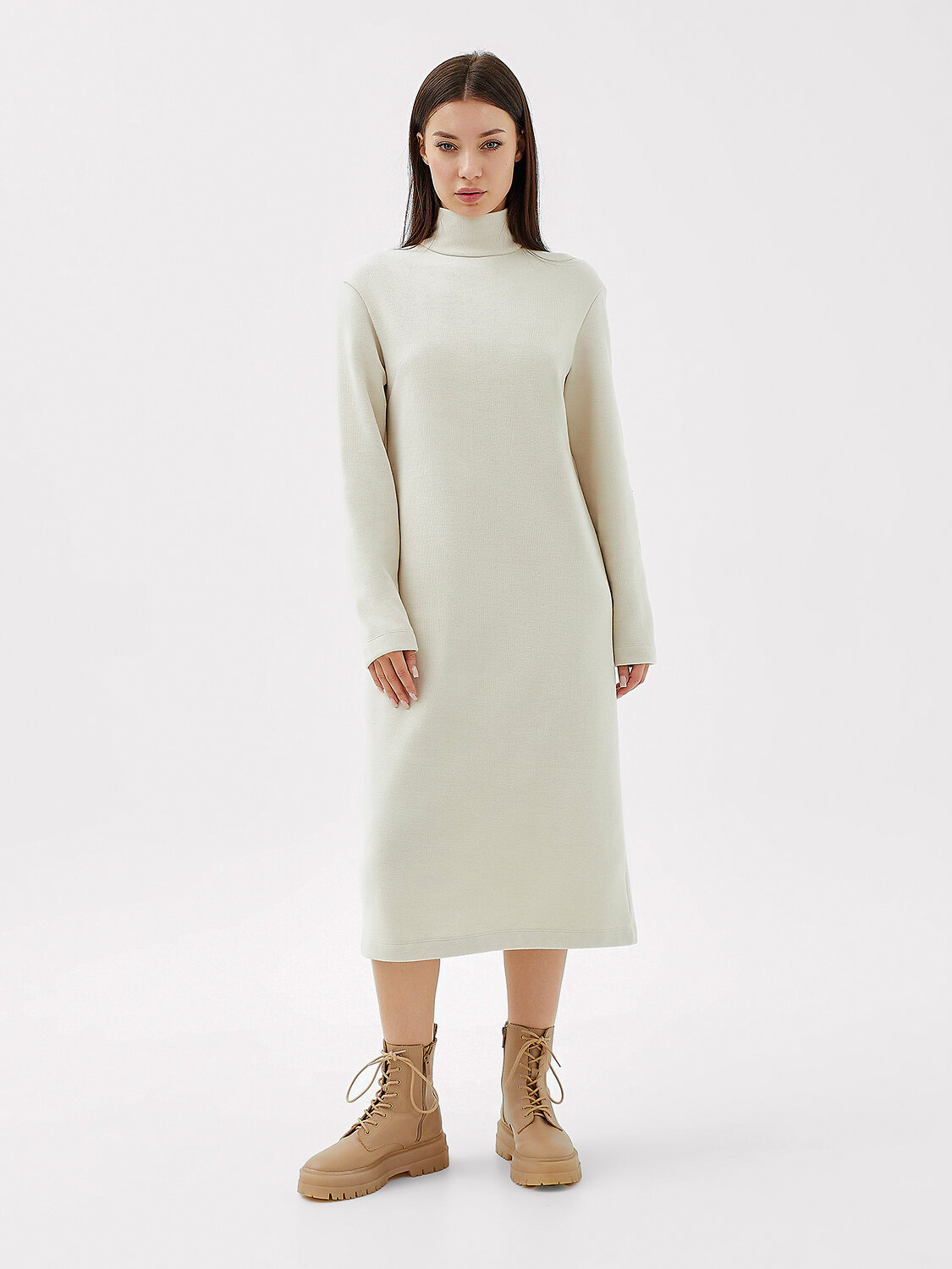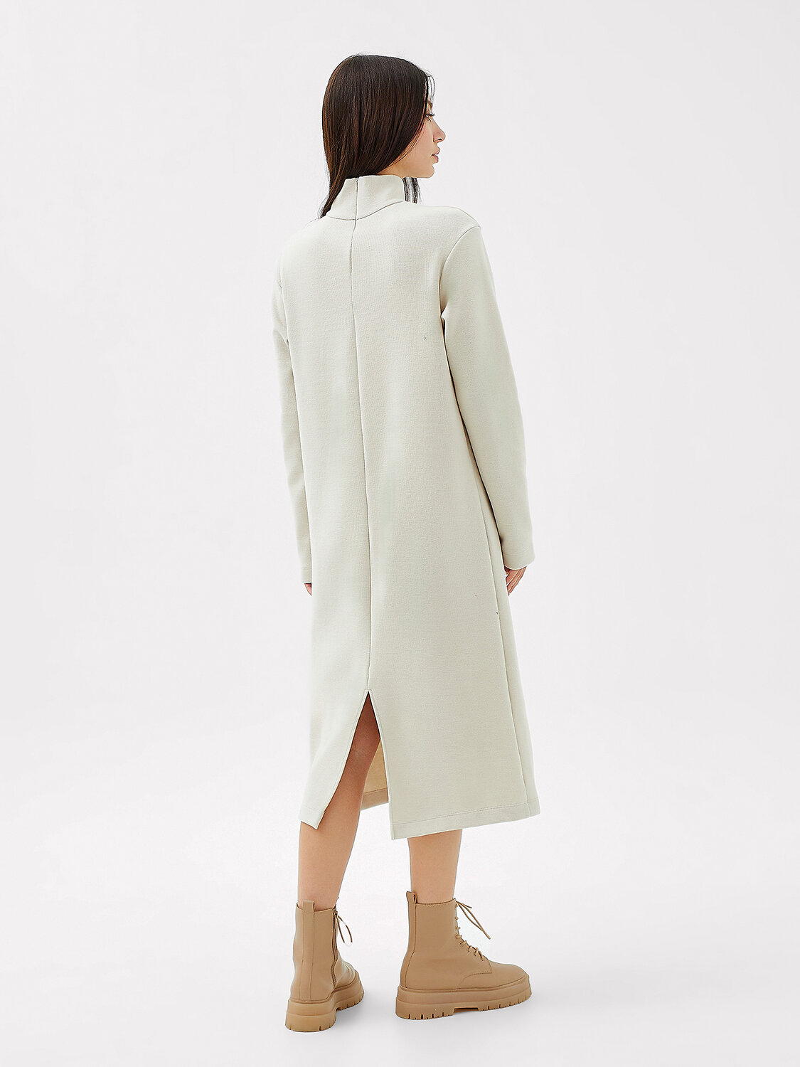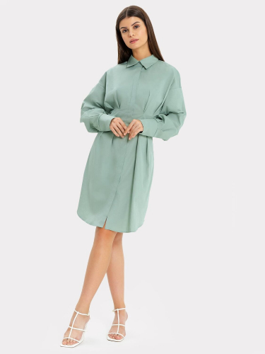 Платье прямого силуэта из трикотажного полотна селаник. Горловина круглой формы с воротником-стойкой. На детали спинки центральная застежка на потайную молнию и обработан разрез. На детали переда вытачки от бокового шва. Рукав втачной длинный.