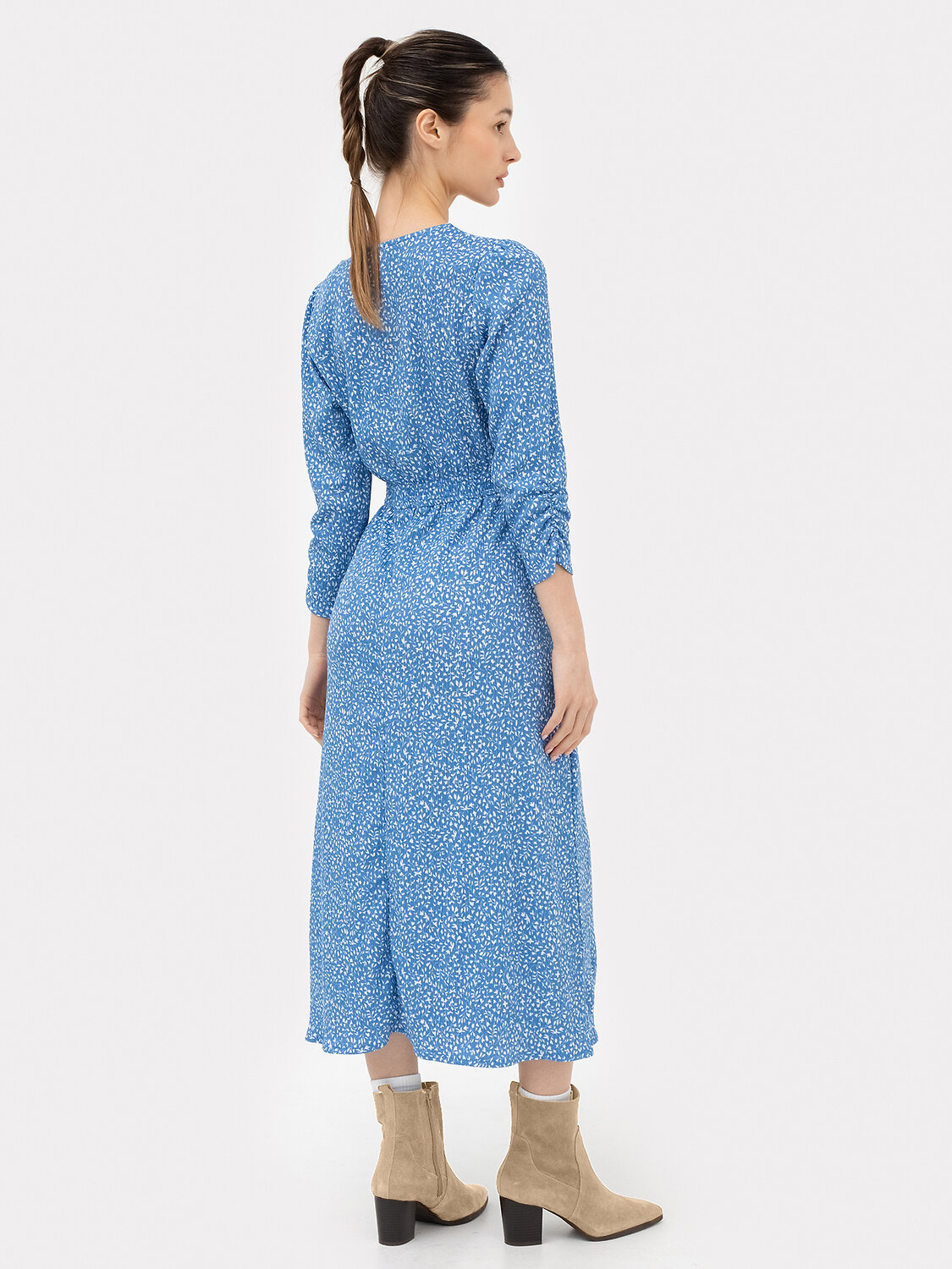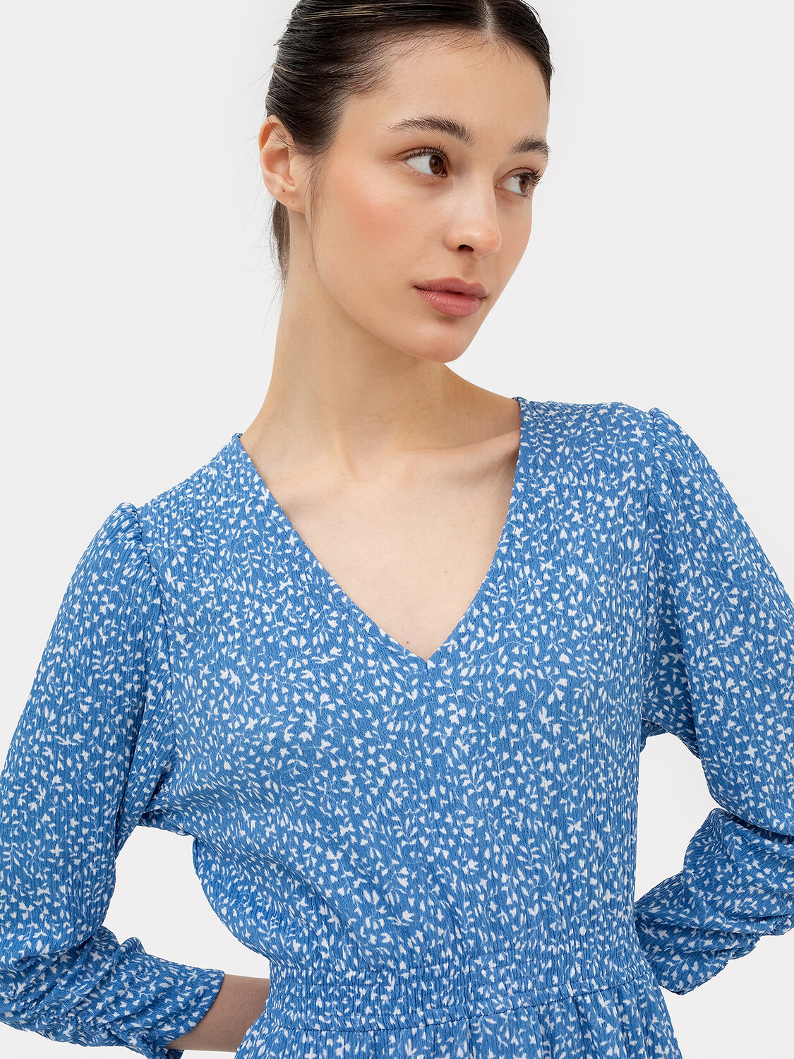 Платье полуприлегающего силуэта из ткани рошель. Горловина V-образной формы. Платье отрезное по талии, с эластичной тесьмой внутри. По эластичной тесьме проложены отделочные строчки. По детали переда средний шов. Детали спинки со средним швом. Рукав втачной, длинный. По окату слегка присборен. Длина рукава 3\4, по низу рукава настрочена эластичная тесьма которая делает сборку. Низ платья расширяется к низу. Длина платья ниже колена.