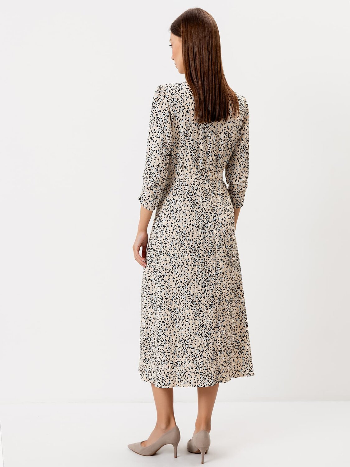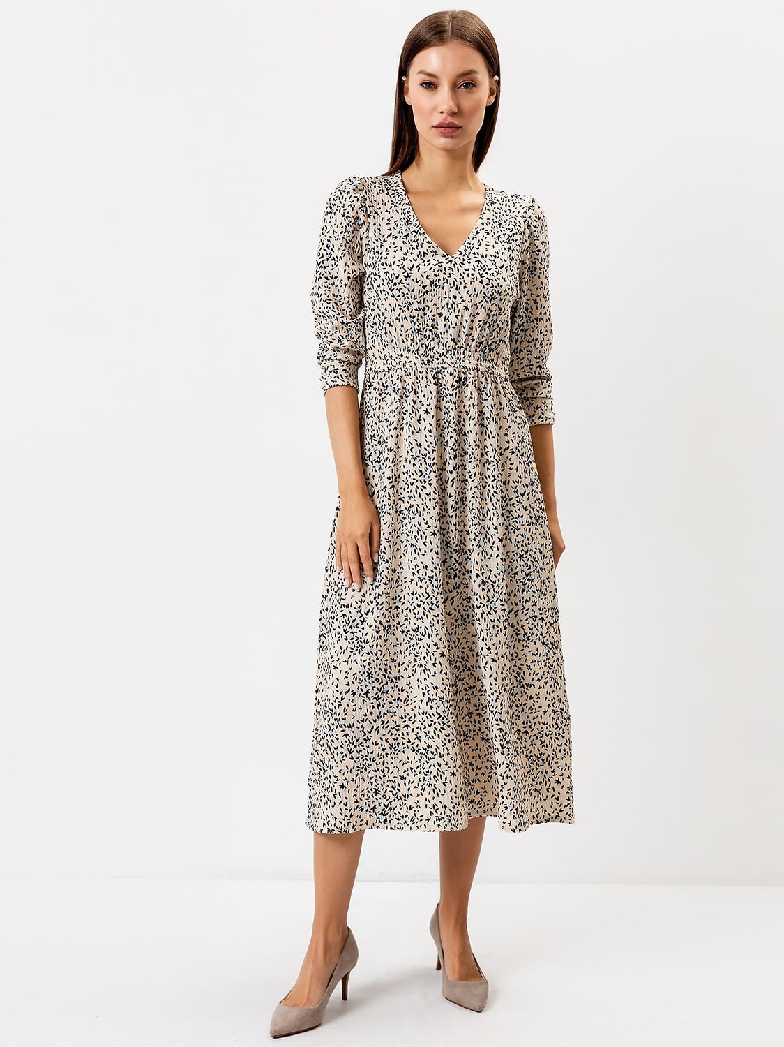 Платье полуприлегающего силуэта из ткани рошель. Горловина V-образной формы. Платье отрезное по талии, с эластичной тесьмой внутри. По эластичной тесьме проложены отделочные строчки. По детали переда средний шов. Детали спинки со средним швом. Рукав втачной, длинный. По окату слегка присборен. Длина рукава 3\4, по низу рукава настрочена эластичная тесьма которая делает сборку. Низ платья расширяется к низу. Длина платья ниже колена.