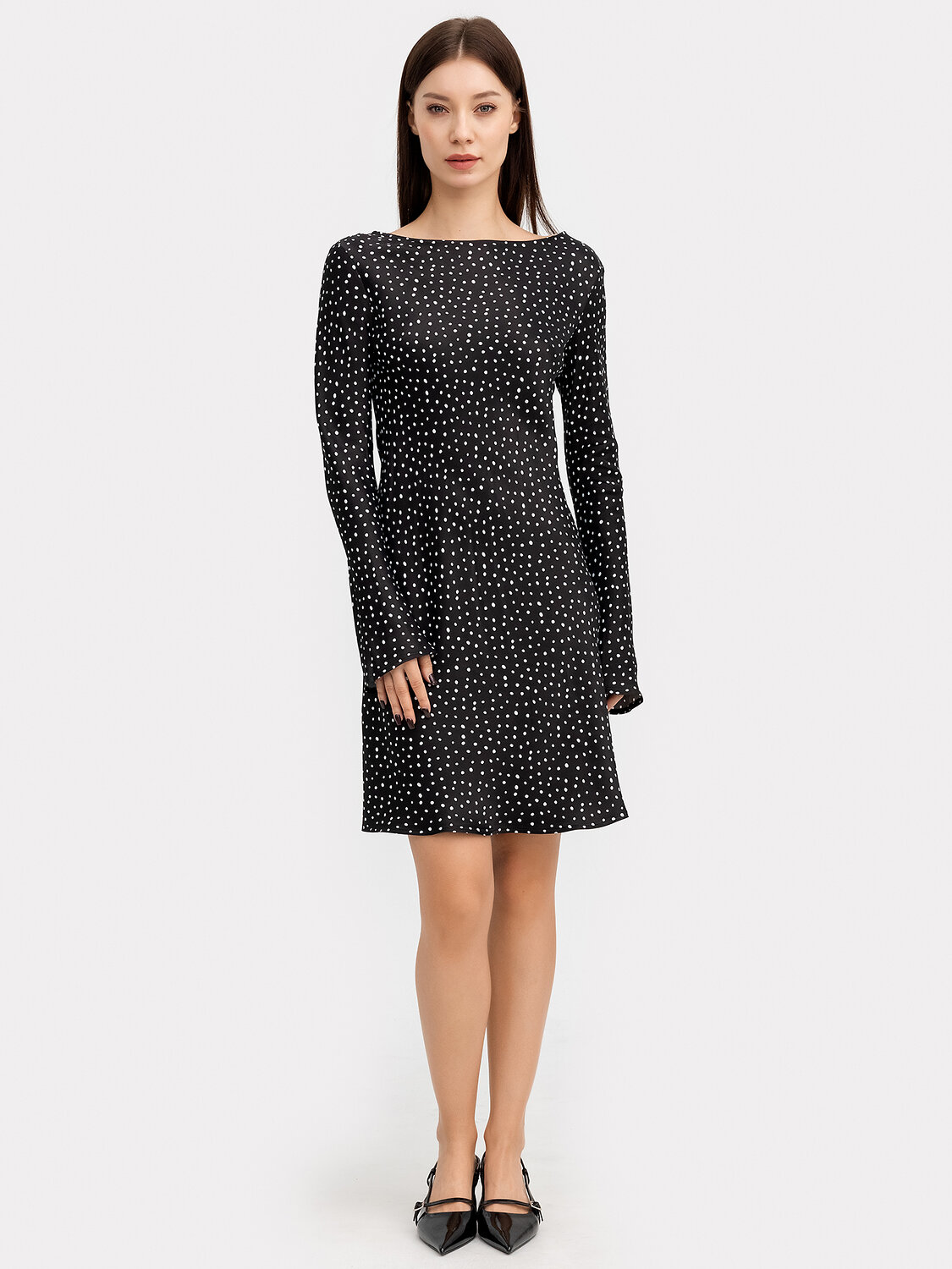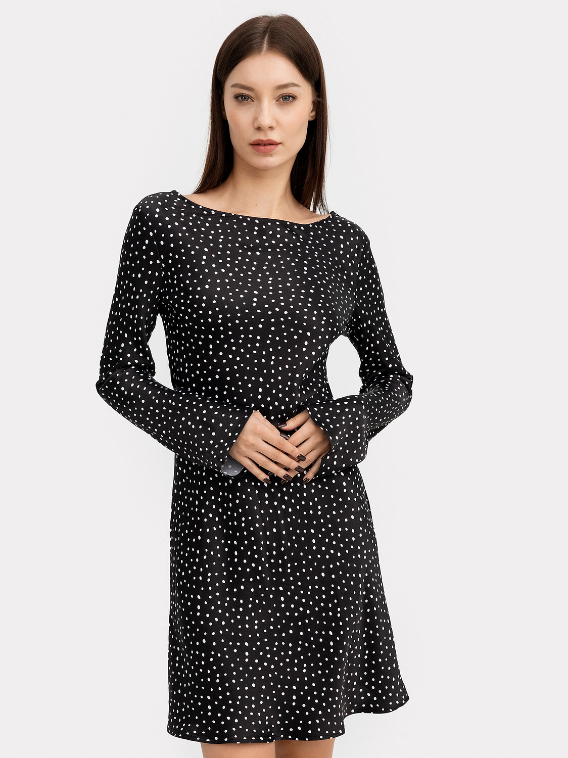 в чистый край. Горловина спинки более вырезана. Рукав втачной длинный, к низу рукав расширяется. Платье длиной выше колена.