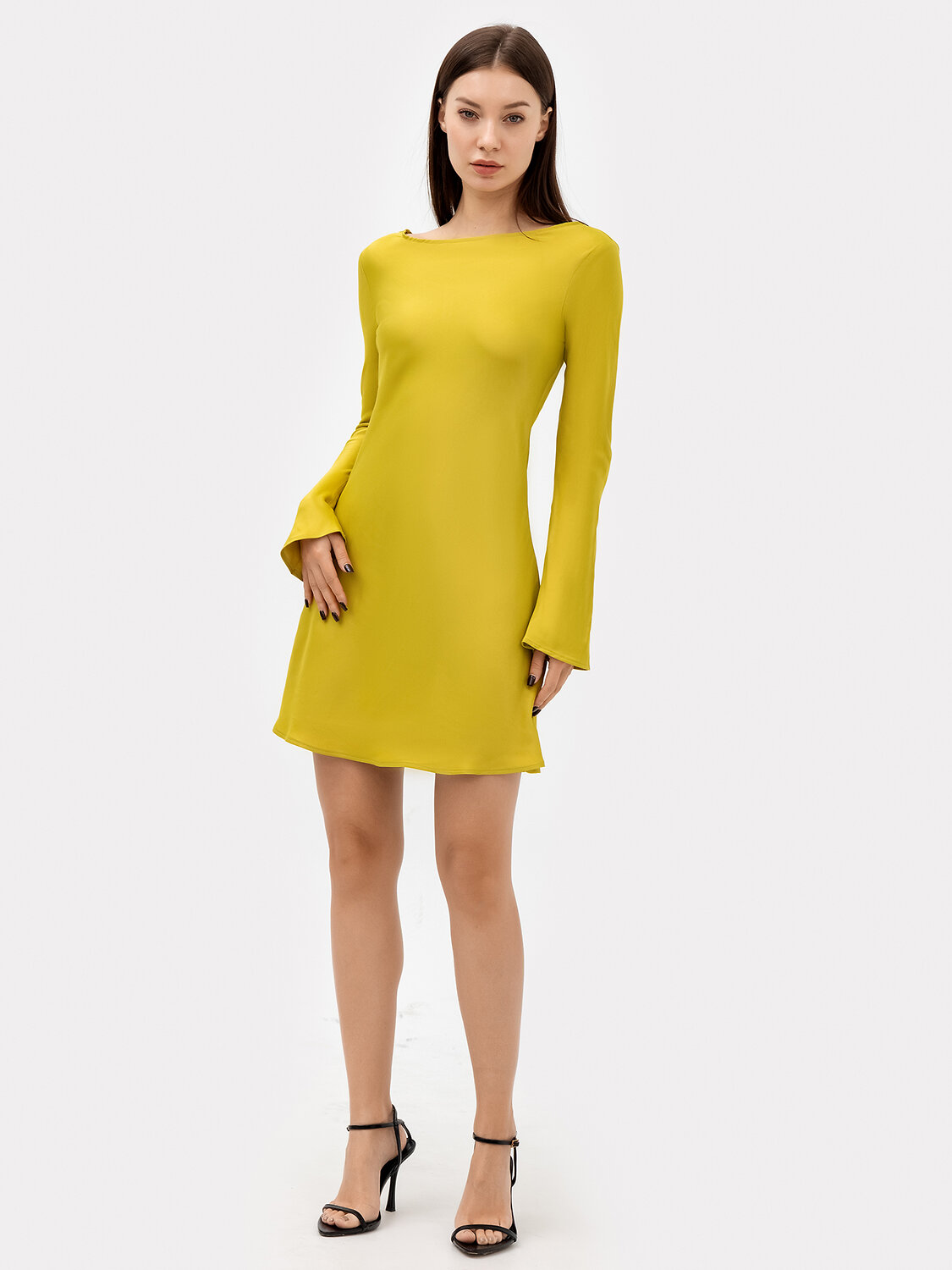 в чистый край. Горловина спинки более вырезана. Рукав втачной длинный, к низу рукав расширяется. Платье длиной выше колена.