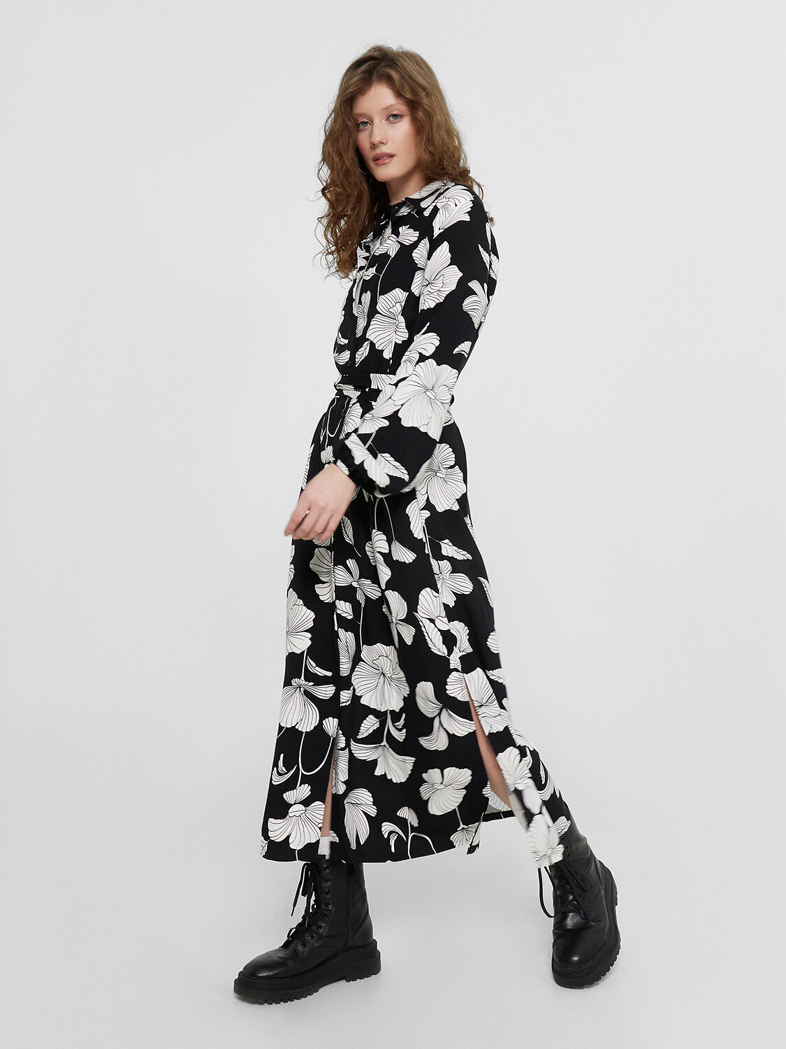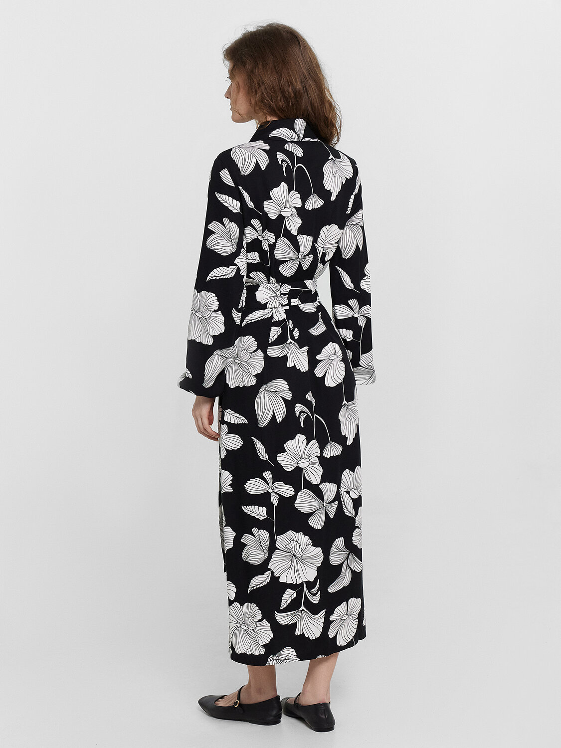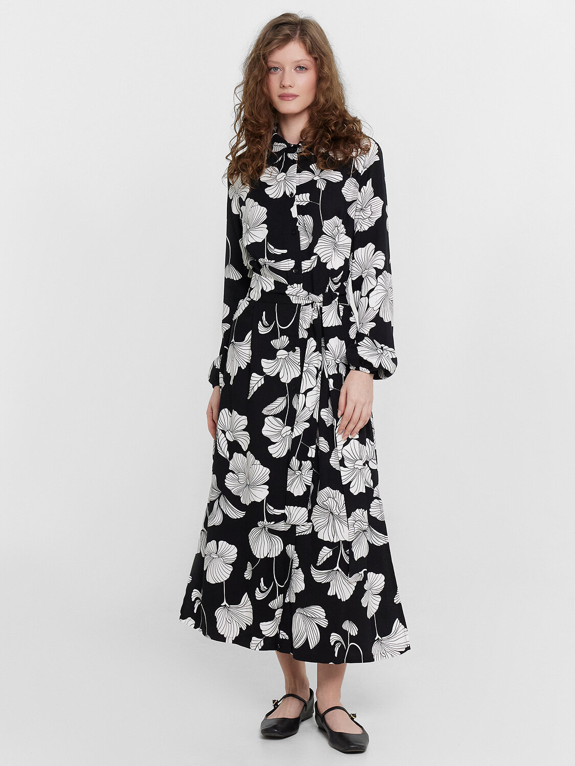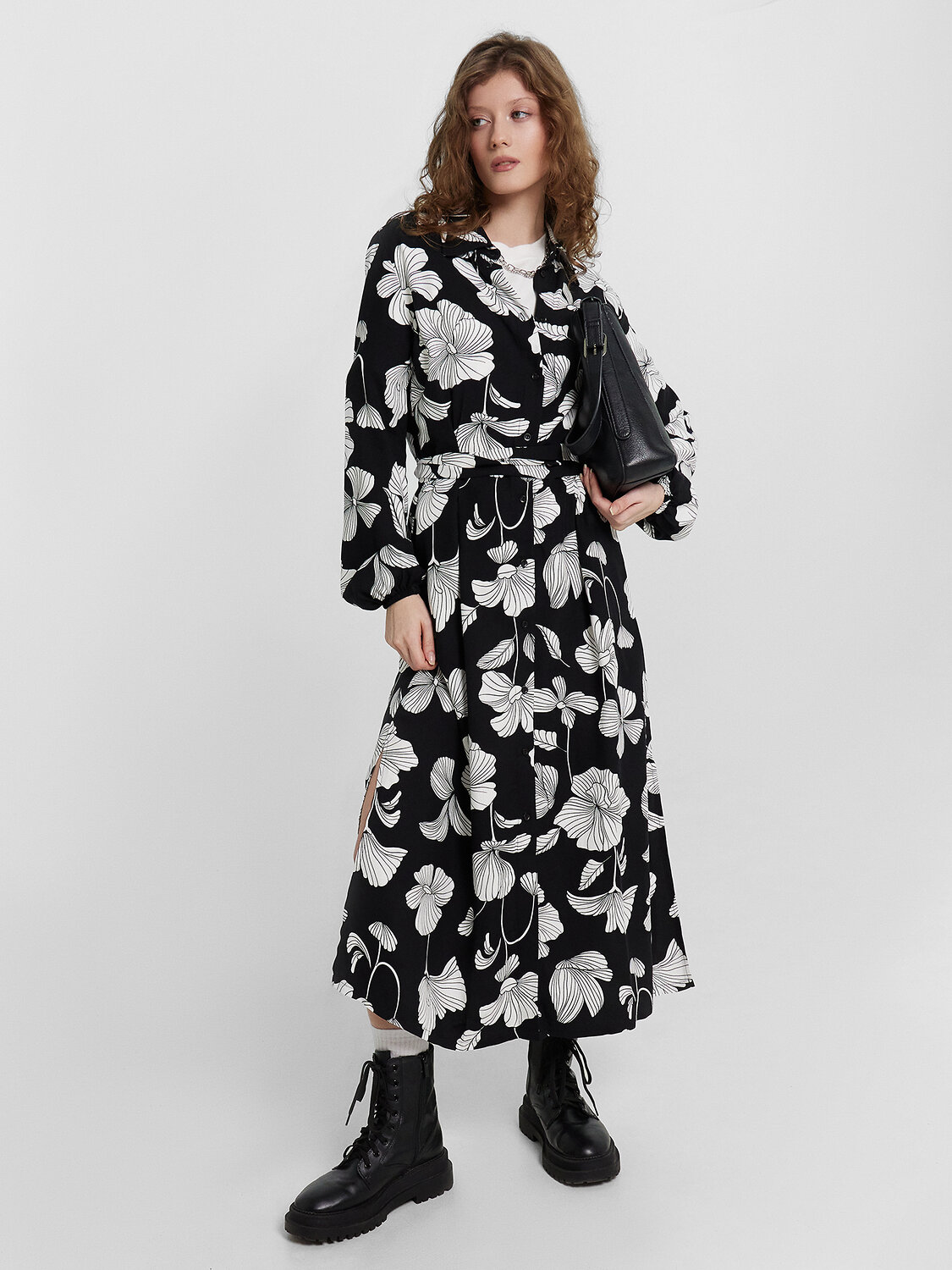 Платье с широким поясом прямого силуэта из ткани. Горловина кргулой формы с втачаным воротником. По переду центральная застежка на пуговицы. На деталях переда и спинки вытачка заложена в одностороннюю складку. Рукав втачной, длинный, по низу подгибка с эластичной тесьмой внутри, образует сборку. В боковых швах обработаны разрезы. Платье длиной ниже колена.