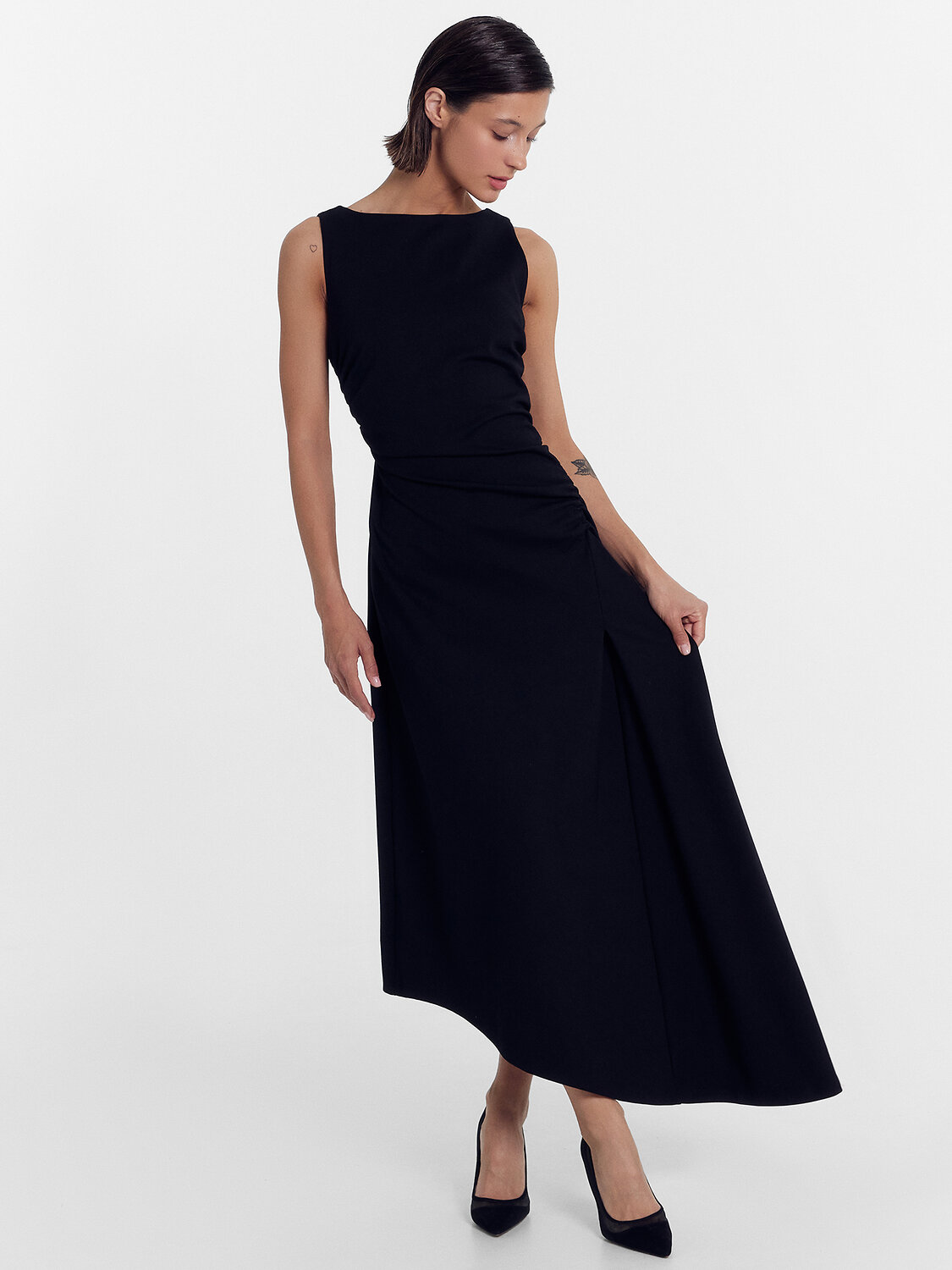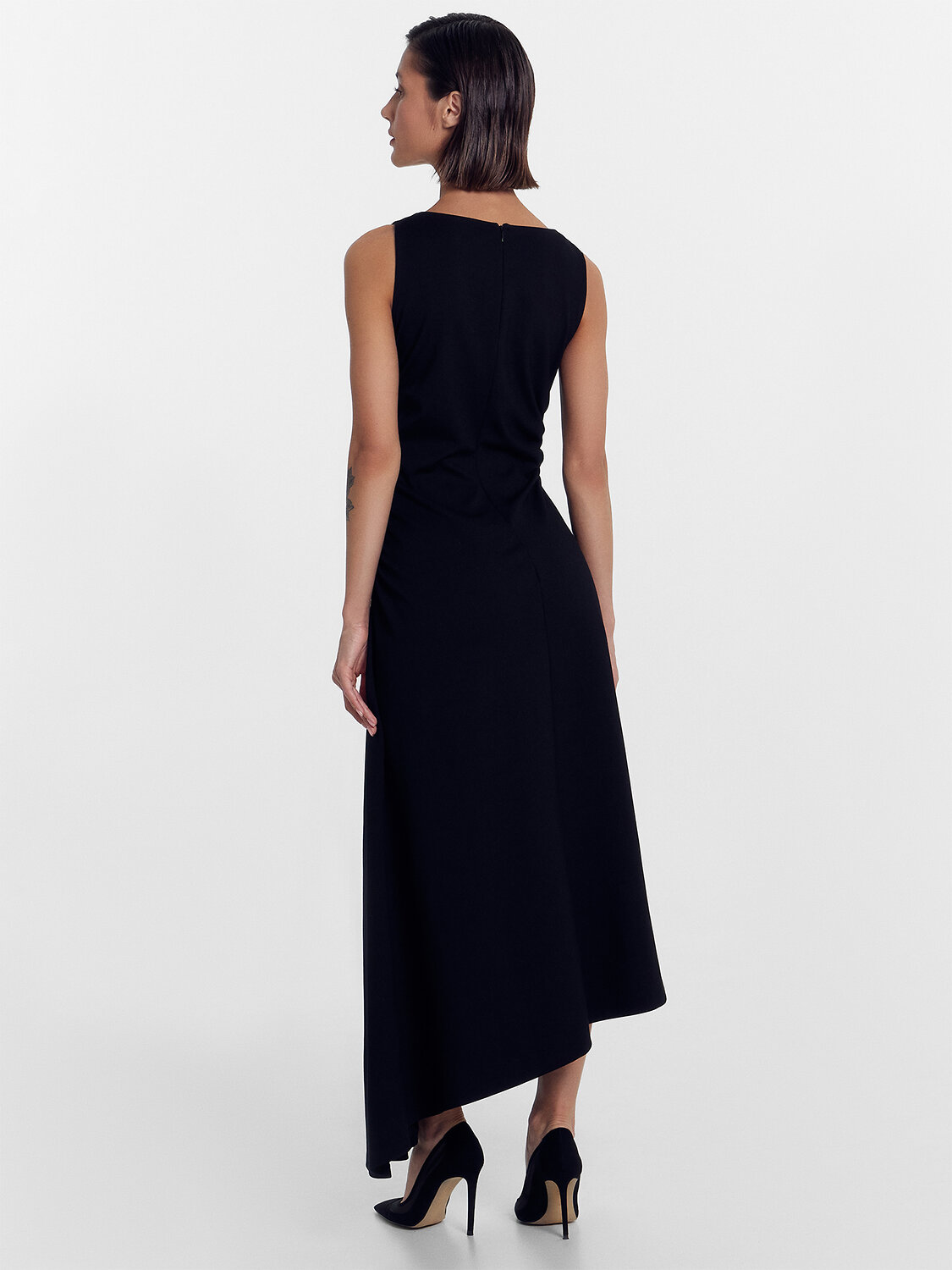 Платье асимметричное. В правом боковом шве сборка на верхней части.