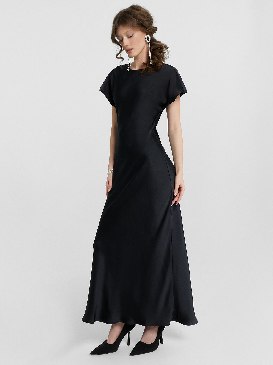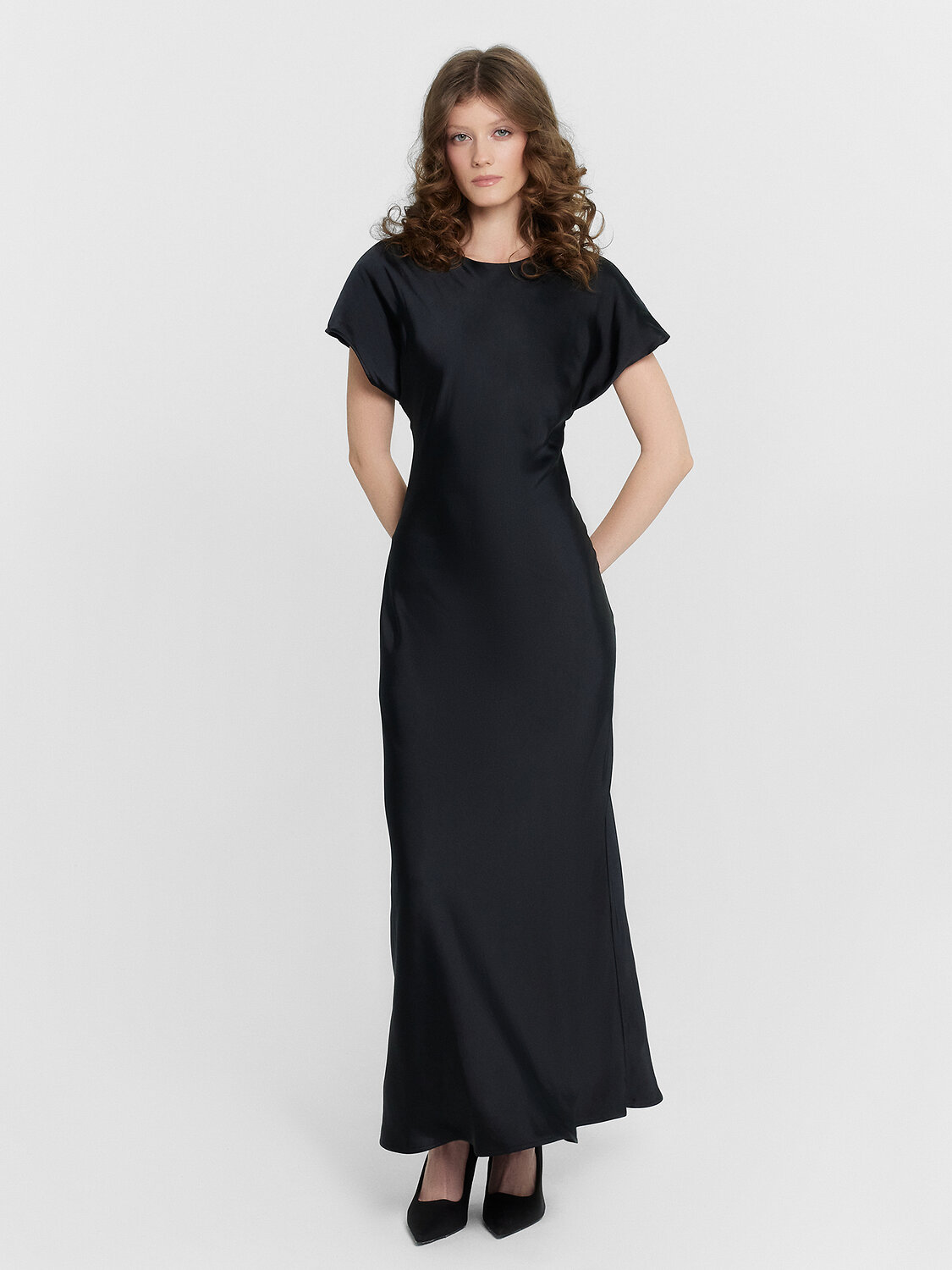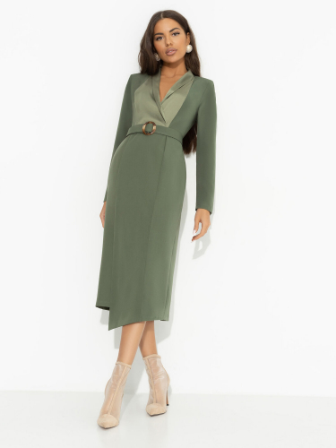 Платье полуприлегающего силуэта, длиной миди. Горловина круглая. Горловина обработана обтачкой из основного полотна. Рукава цельнокроеные короткие. Спинка со средним швом. В среднем шве обработана застежка на петлю (жилка 4мм WT4-4) и пуговицу (D10мм). Нижние срезы платья и рукавов обработаны швом вподгибку с закрытым срезом.