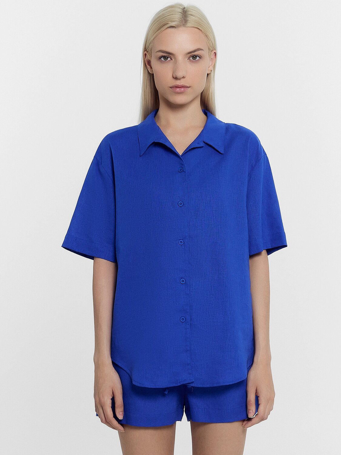 Комплект женский состоит из жакета и шорт. Жакет свободного силуэта, с воротником стойкой. Рукав втачной короткий, рукав обработан в подгибку. Жакет с центральной застежкой с петлями и пуговицами. Низ застрочен швом в подгибку. Шорты свободного силуэта, высокая посадка. Верх застрочен в подгибку с протянутым шнуром из основного полотна. В боковых швах карманы. Низ шорт обработан вподгибку.