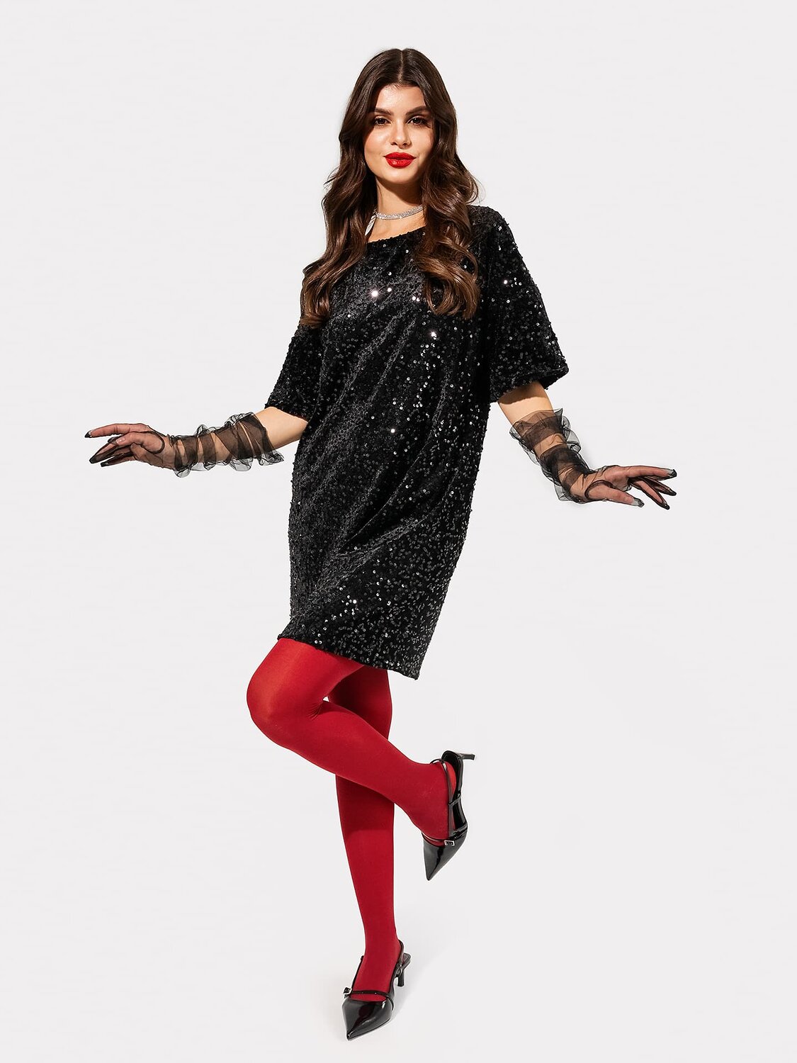 Платье длиной выше колена.