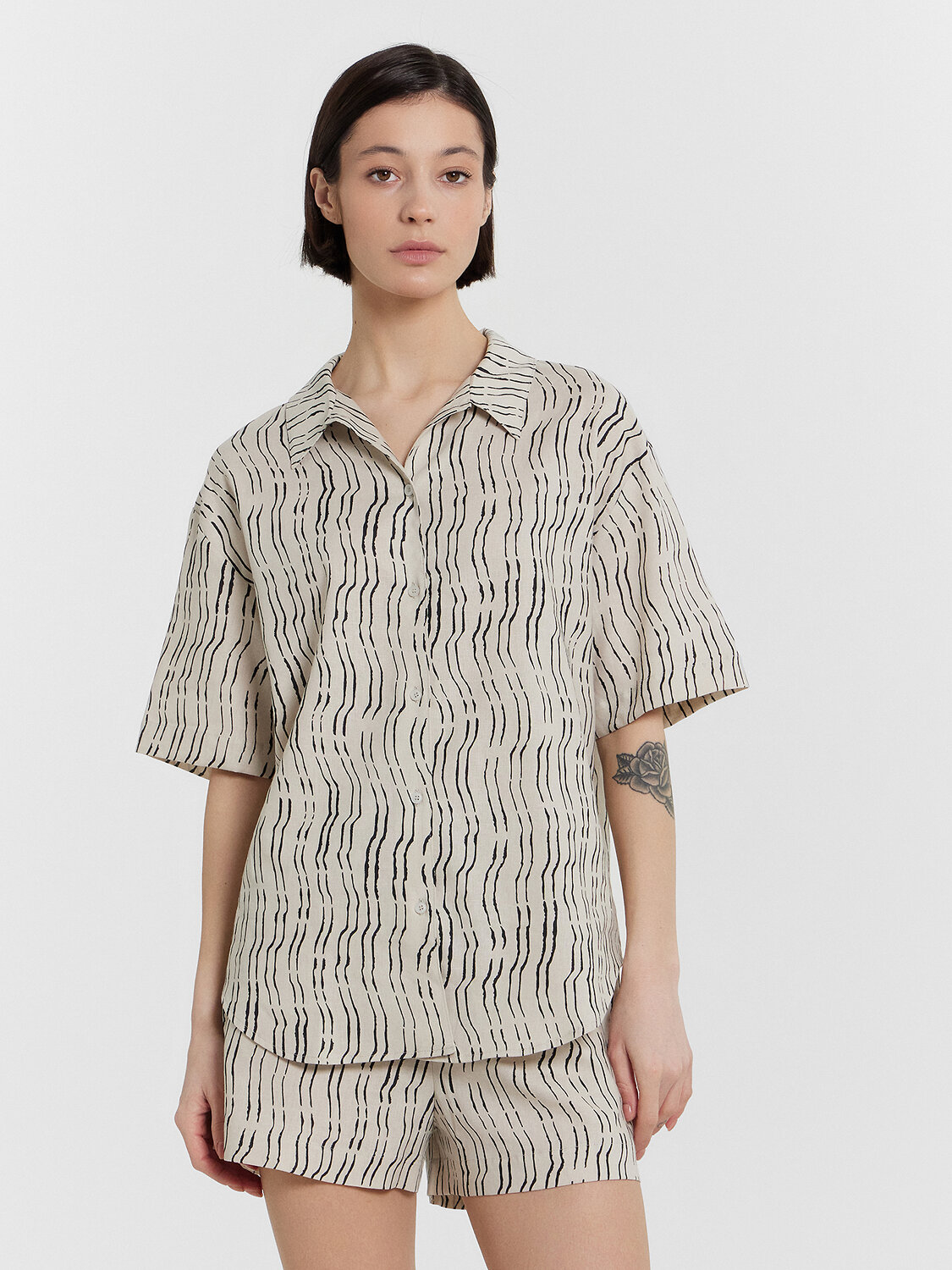 Комплект женский состоит из жакета и шорт. Жакет свободного силуэта, с воротником стойкой. Рукав втачной короткий, рукав обработан в подгибку. Жакет с центральной застежкой с петлями и пуговицами. Низ застрочен швом в подгибку. Шорты свободного силуэта, высокая посадка. Верх застрочен в подгибку с протянутым шнуром из основного полотна. В боковых швах карманы. Низ шорт обработан вподгибку.