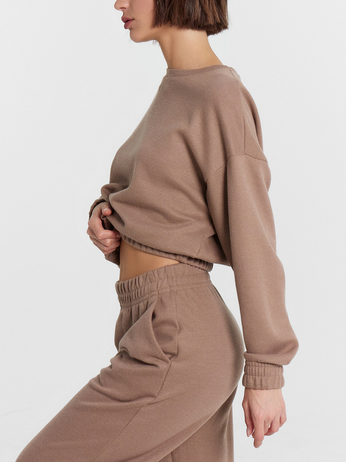 вырез горловины, рукав втачной со спущенной линией плеча. Горловина обработана обтачкой из основного полотна. По низу рукавов и свитшота притачены манжеты и пояс из основного полотна.