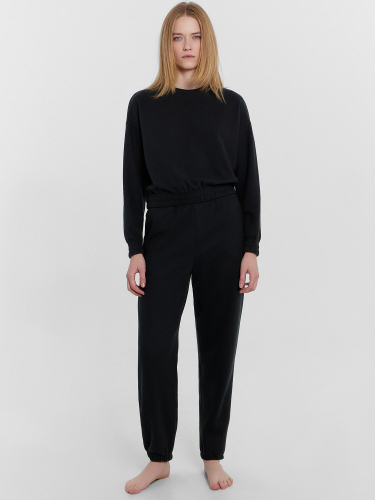 Брюки свободного силуэта. Пояс цельнокроеный, с втаченной эластичной тесьмой, отстрочен, 2 шва. На передних деталях карманы «хулиганы». Низ брюк обработан в подгибку с эластичной тесьмой.