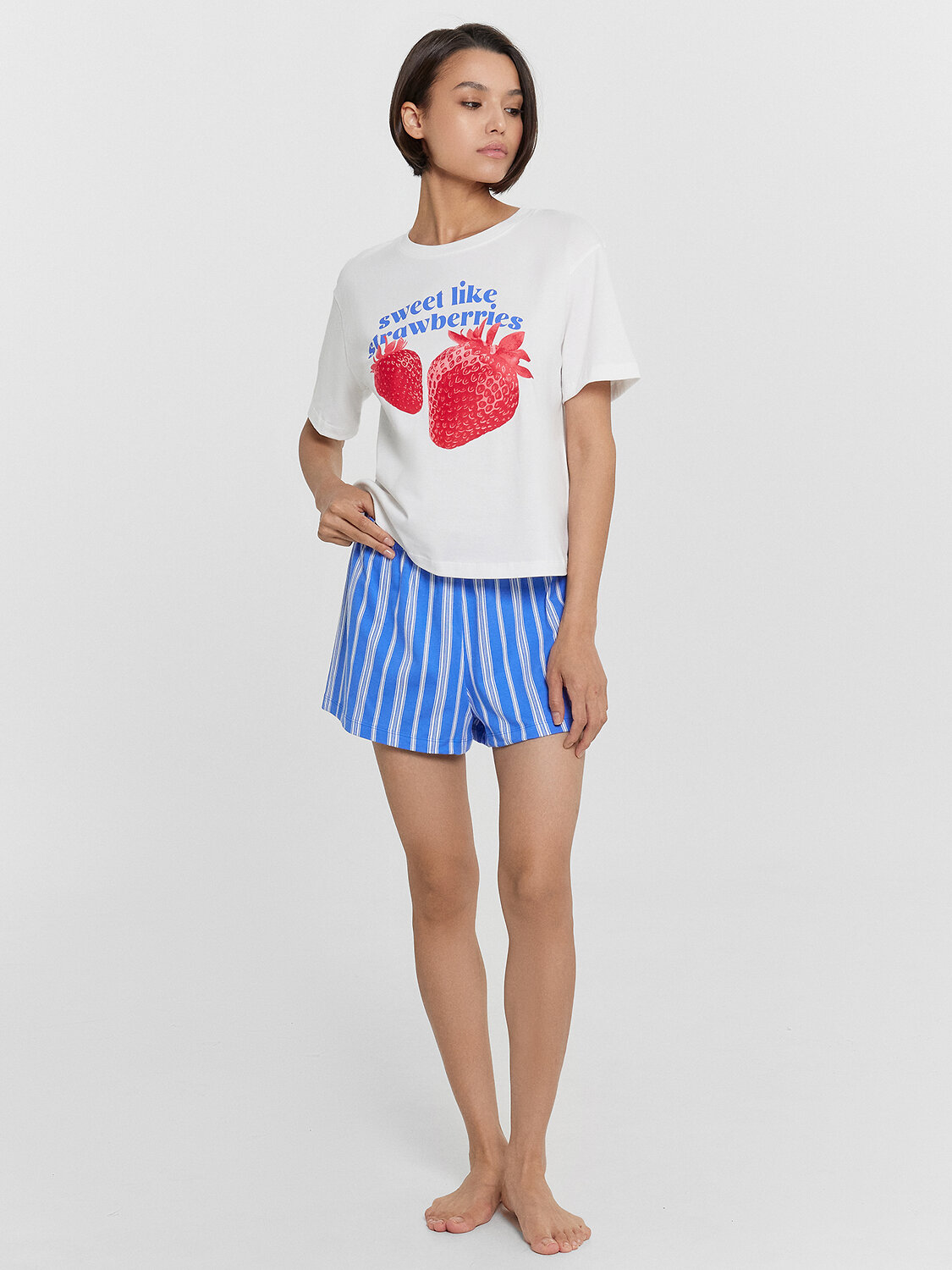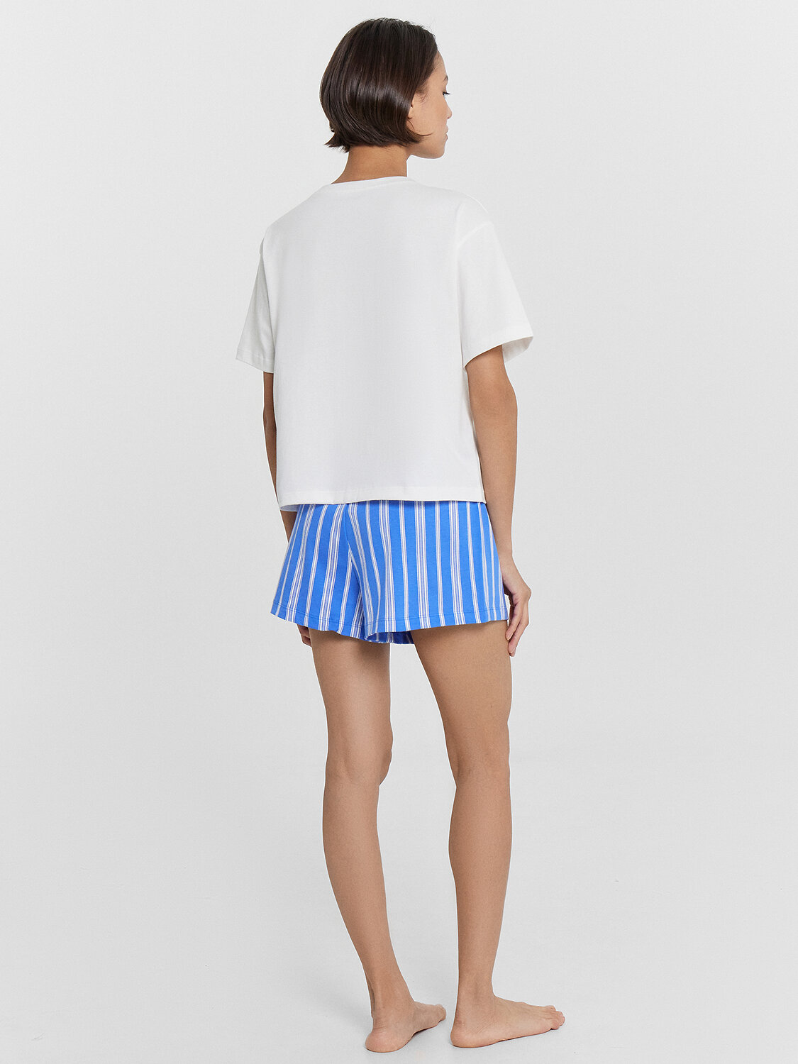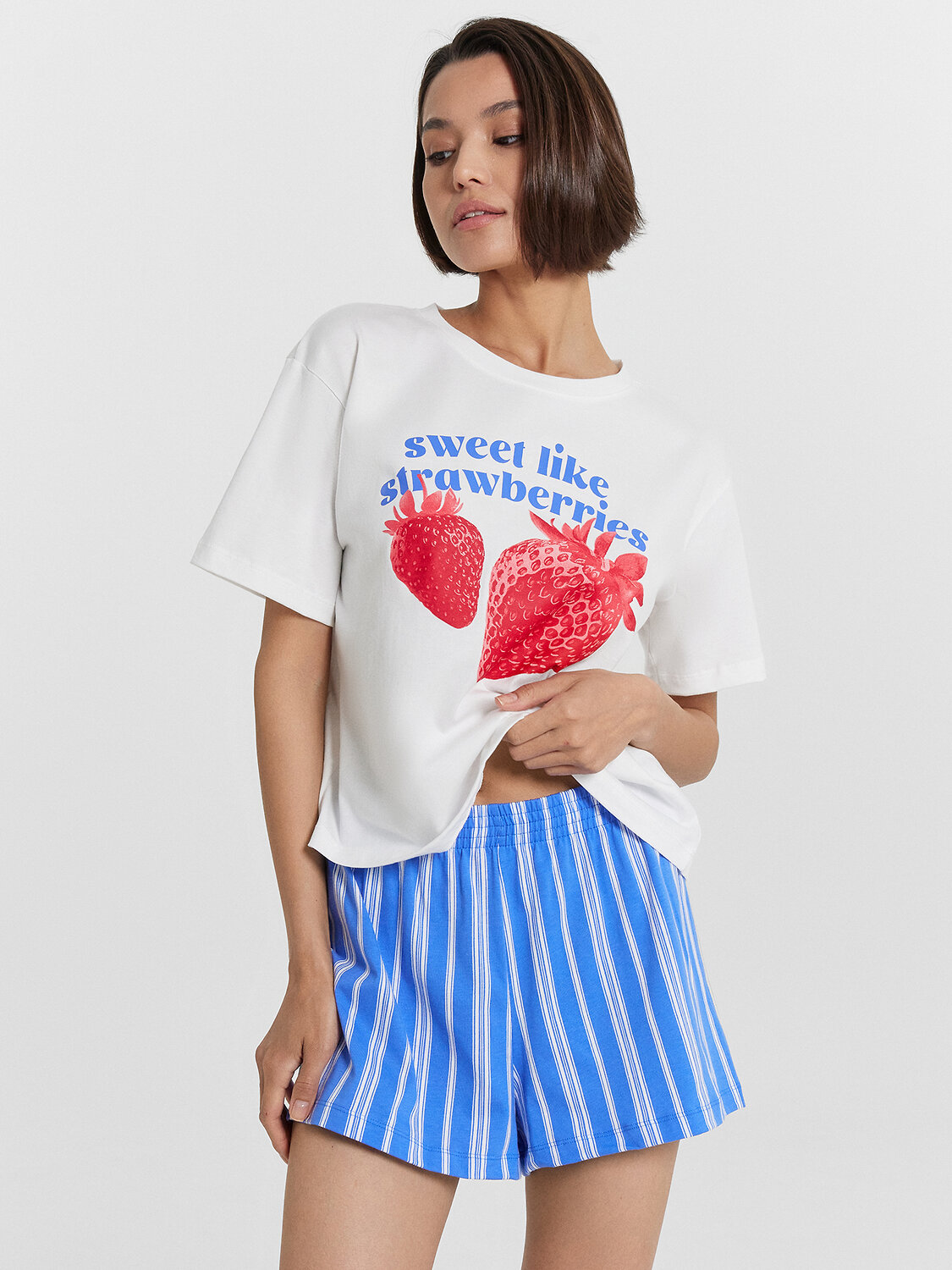Комплект женский состоит из футболки и шорт. Футболка свободного силуэта. Горловина круглой формы, обтачка из основного полотна. Рукава втачные свободные, линия плеча слегка спущена. Низ рукавов и футболки в подгибку.