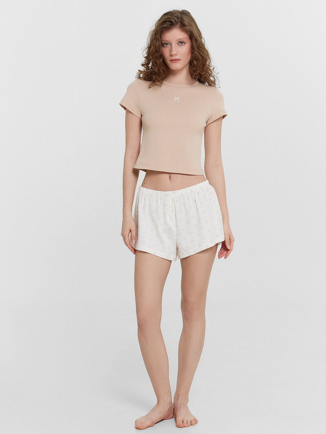 Эта женская пижама — гармоничное сочетание практичности, комфорта и стильного дизайна. Укороченная футболка прилегающего силуэта подчеркивает фигуру, обеспечивая комфорт и легкость. Круглая горловина добавляет аккуратности, а короткие рукава делают модель подходящей для теплого времени года. Нижние края обработаны швом вподгибку, что придает изделию завершенный вид и гарантирует долговечность. Шорты прилегающего силуэта дополняют комплект, создавая элегантный и женственный образ. Эластичный пояс обеспечивает удобную посадку, а декоративный гульфик с пуговицами акцентирует внимание на деталях, добавляя модели оригинальности. Нижние края шорт также обработаны швом вподгибку, подчеркивая качественное исполнение. Пижама выполнена из натурального хлопка — материала, который славится своей мягкостью, воздухопроницаемостью и гипоаллергенностью. Такая ткань идеальна для домашней одежды, обеспечивая комфорт и приятные ощущения на протяжении всего дня. Эта модель станет прекрасным выбором для сна или расслабленного отдыха дома.