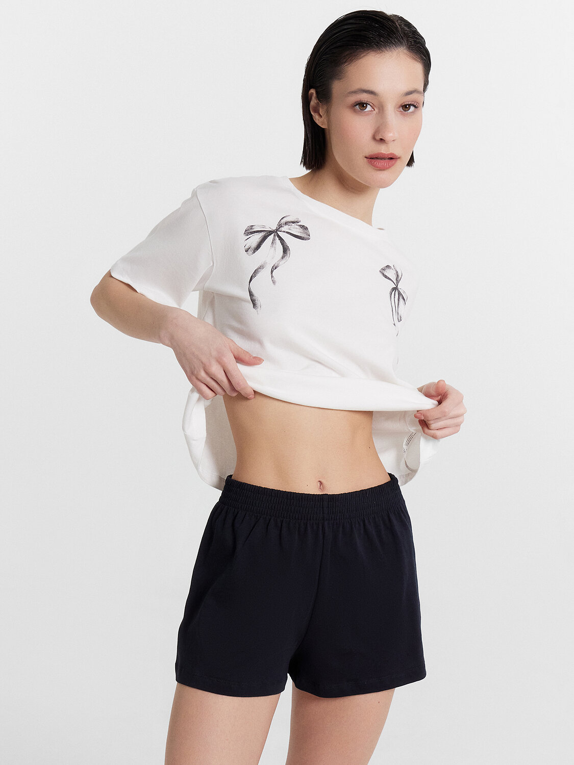 Шорты свободного силуэта, короткие. Пояс цельнокроеный, с втаченой эластичной тесьмой. Низ шорт обработан швом в подгибку.