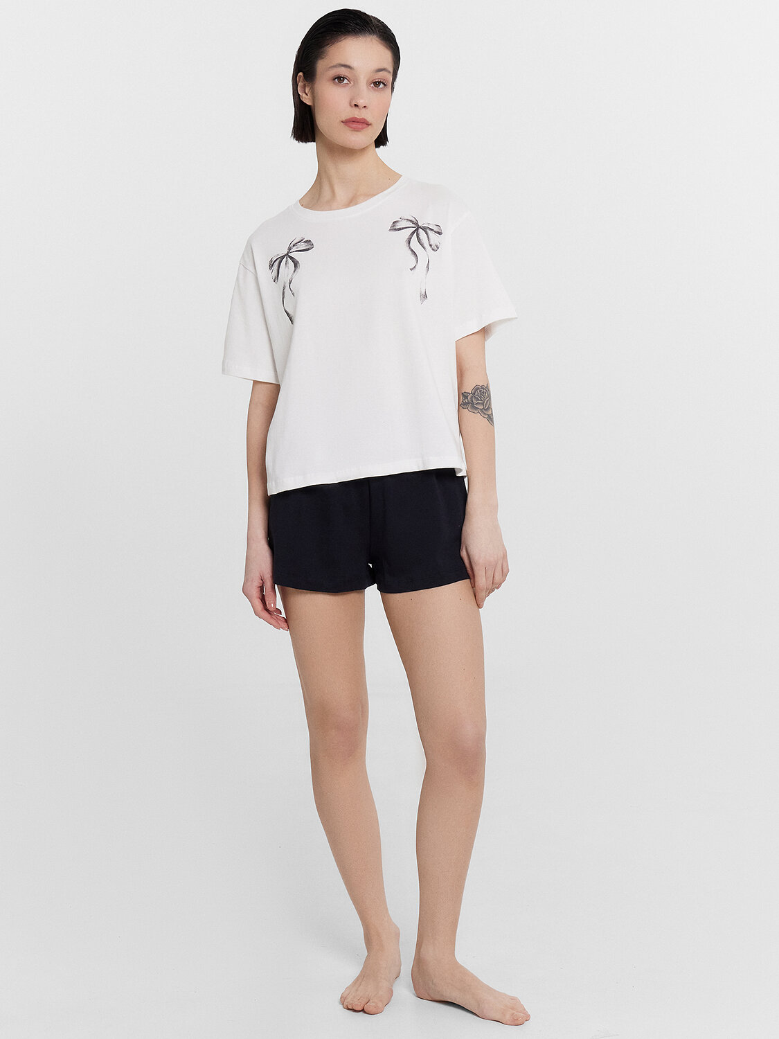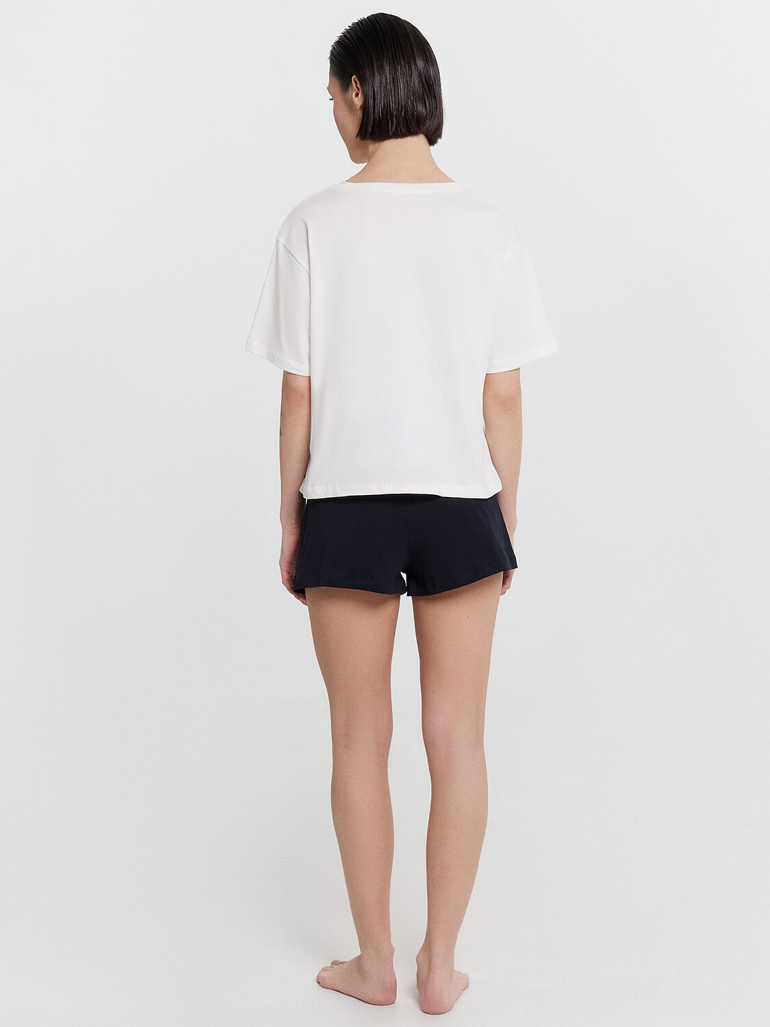 Комплект женский состоит из футболки и шорт. Футболка свободного силуэта. Горловина круглой формы, обтачка из основного полотна. Рукава втачные свободные, линия плеча слегка спущена. Низ рукавов и футболки в подгибку.