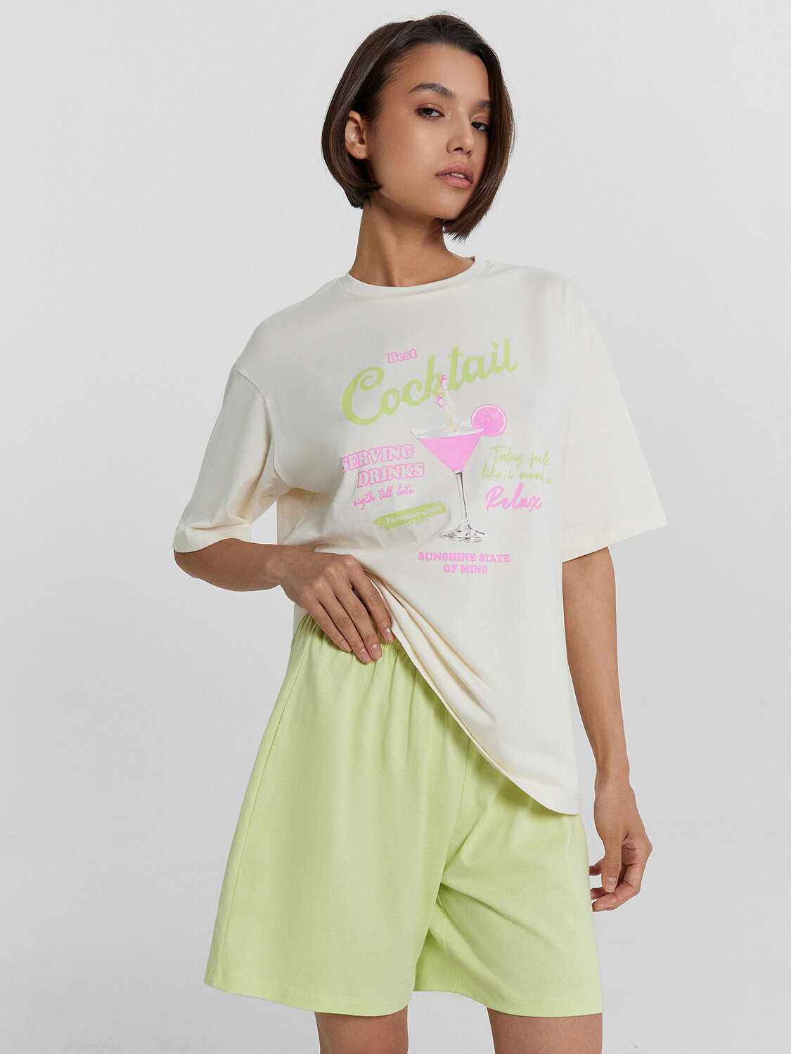 Женская пижама Mark Formelle станет идеальным дополнением вашего домашнего гардероба. Свободная футболка с круглой горловиной и короткими рукавами со спущенной линией плеча обеспечивает максимальный комфорт и свободу движений. Шорты свободного кроя с эластичным поясом идеально сидят на талии, не стесняя движений и обеспечивая удобство на протяжении всего дня. Изделие выполнено из нежной кулирки - мягкого и приятного к телу материала, который отличается дышащими свойствами и гипоаллергенностью. Подарите себе или своим близким эту чудесную пижаму и наслаждайтесь уютными домашними вечерами.