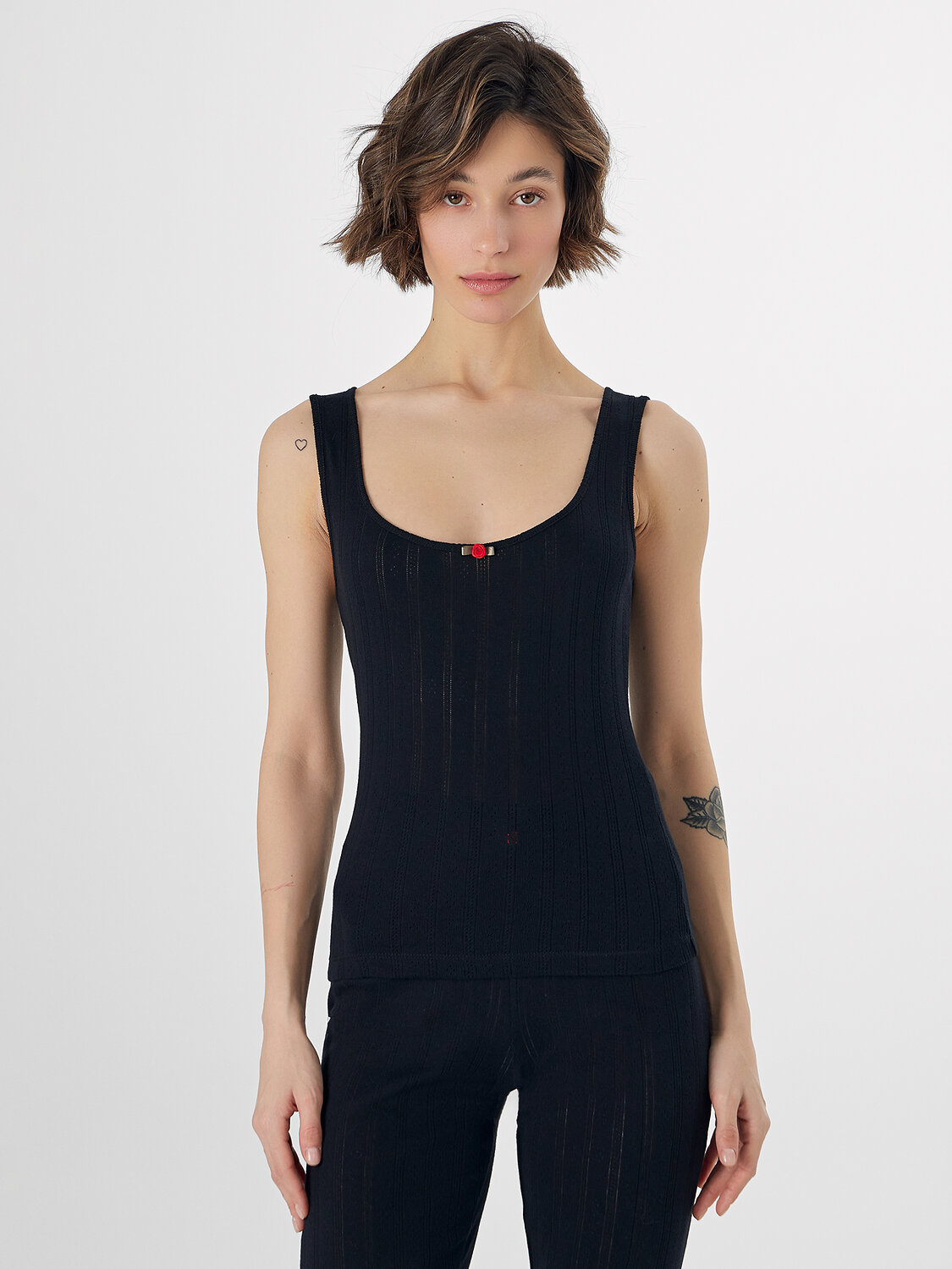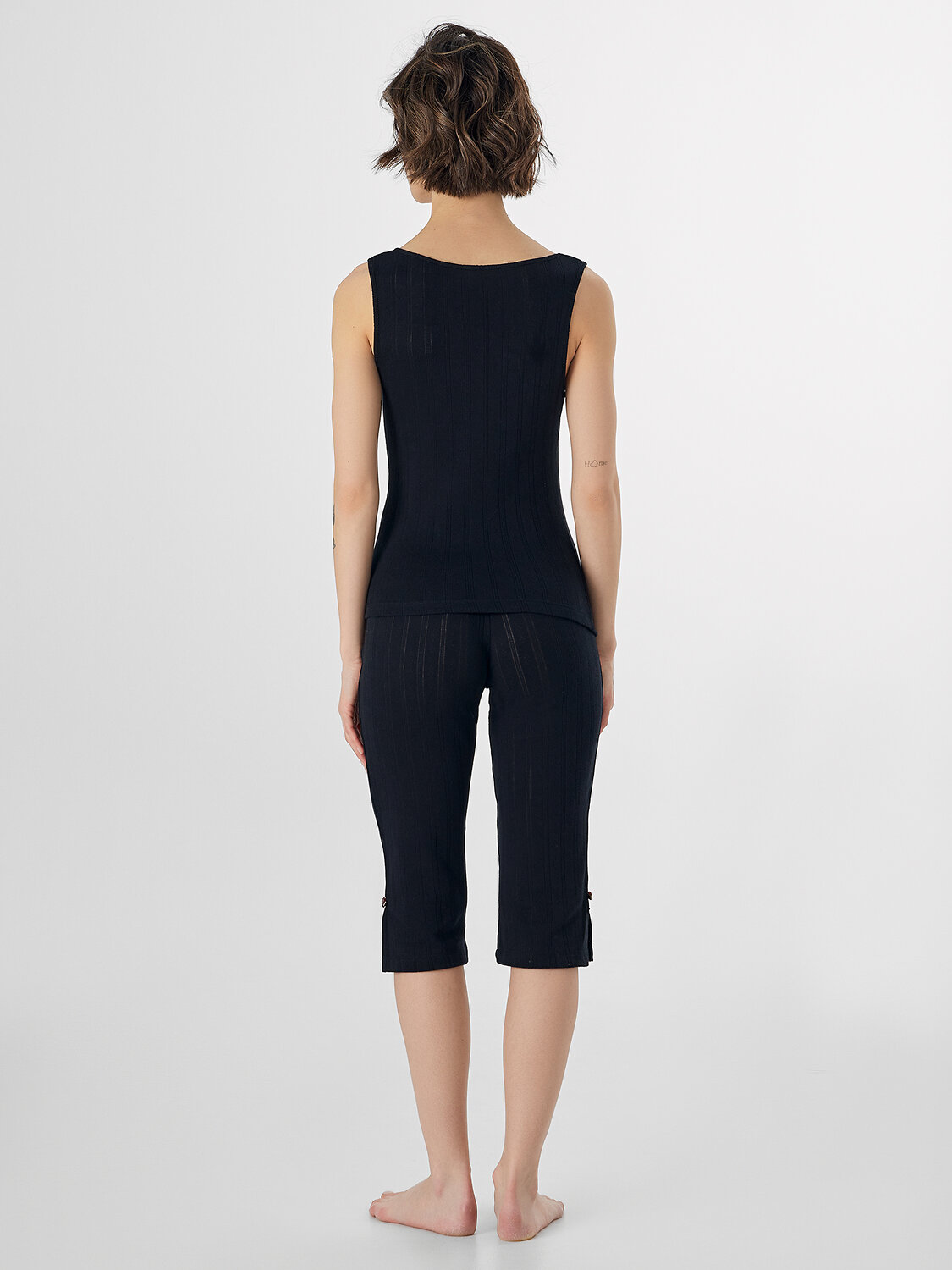 Домашний комплект — это элегантный набор из блузы на широких бретелях и бриджей. Выполнен из мягкого хлопкового трикотажа с фактурой рибана и создан для комфортного отдыха дома.