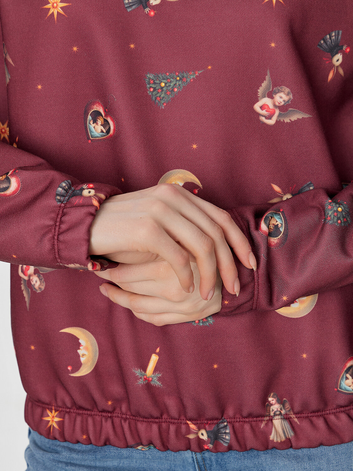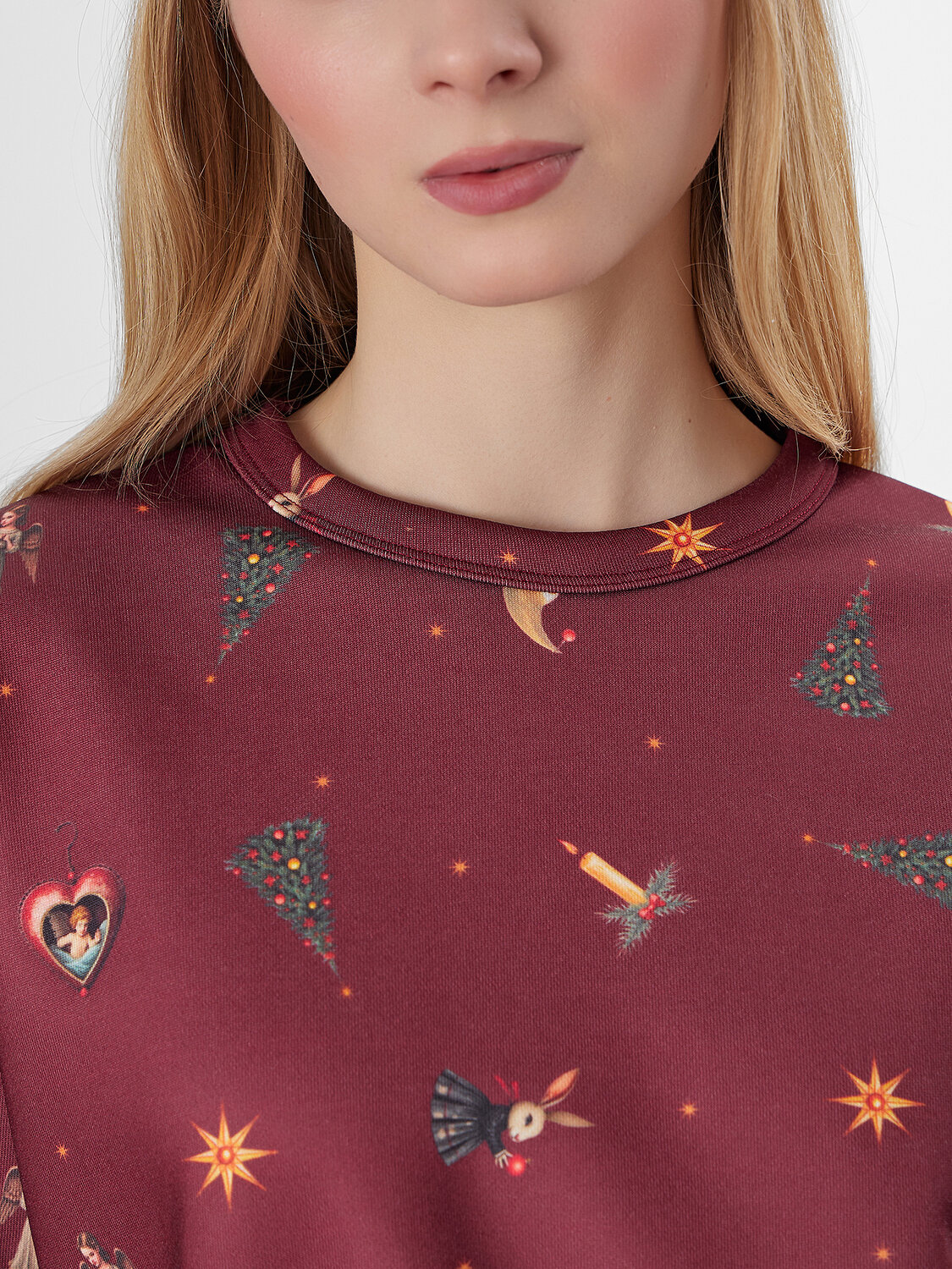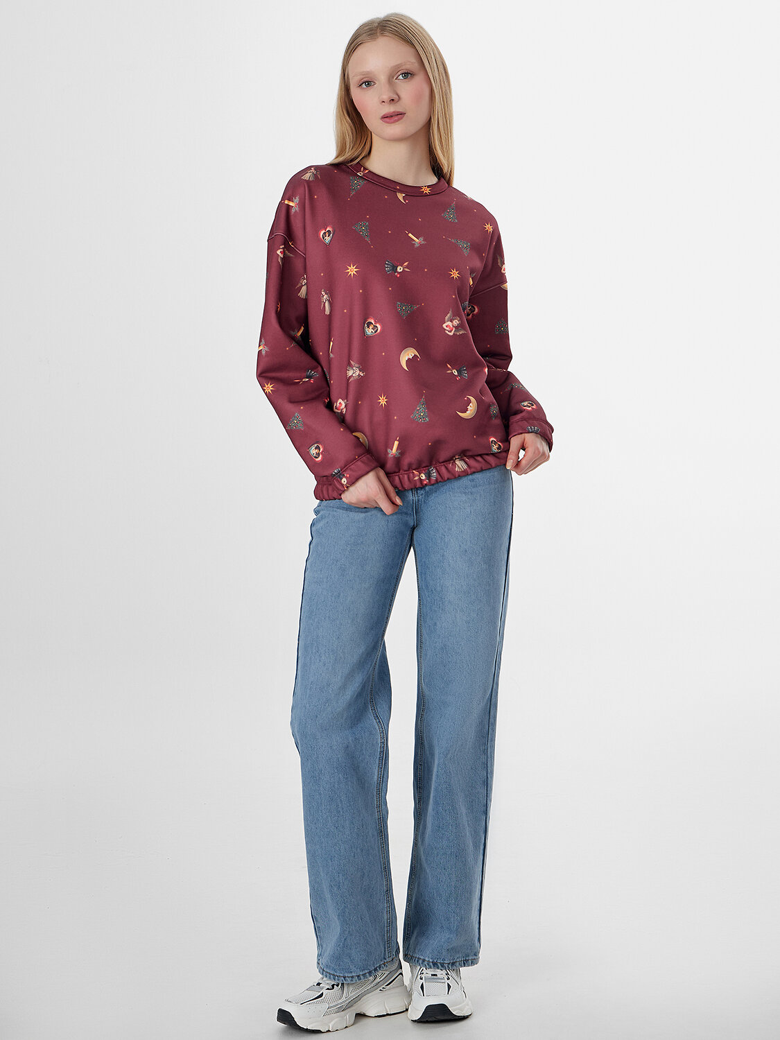 Бордовый свитшот из лимитированной коллекции Mark Formelle x Ольга Бузова с графичным узором игрушек на бордовом фоне станет ярким акцентом в вашем гардеробе. Его свободный силуэт со спущенным плечом и длинными рукавами дарит ощущение расслабленности и повседневного уюта, не ограничивая движений.