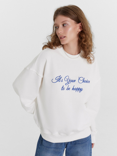 Объемный женский свитшот свободного силуэта из футера с теплым и нежным подчесом. Вырез классический, круглый. Рукава типа "реглан" со значительно спущенной линией плеча дарят особый комфорт. По низу свитшота – свободный широкий пояс из рибаны. Это тренд!
