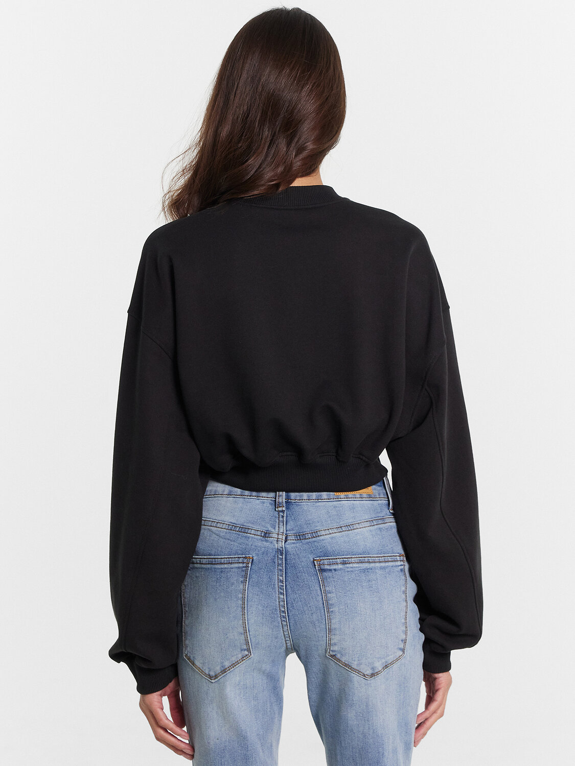 Стильный укороченный женский свитшот станет ярким дополнением вашего гардероба. Модель свободного силуэта выполнена из футера без подчеса, что делает ее легкой и удобной для носки в любое время года. Материал обеспечивает мягкость и приятные ощущения на коже, позволяя вам чувствовать себя комфортно. Круглая горловина, спущенное плечо и углубленная пройма придают этому свитшоту современный вид. А длинные объемные рукава с эластичными манжетами из рибаны добавляют изделию стильности и обеспечивают удобство.
