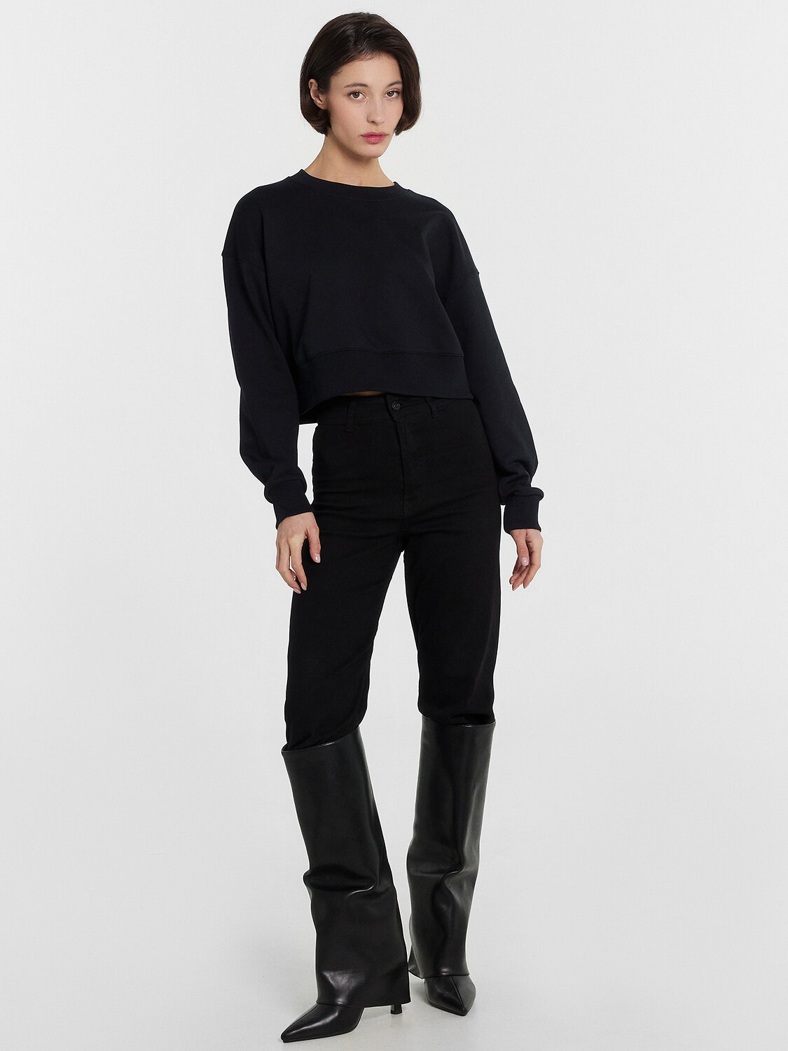 Свитшот изготовлен из трикотажного полотна футер 3х нитка без подчеса. Свитшот свободный, укороченный. Горловина обработана обтачкой из рибаны. Рукава втачные длинные с отрезными манжетами из рибаны. По низу свитшота отрезной пояс из рибаны.