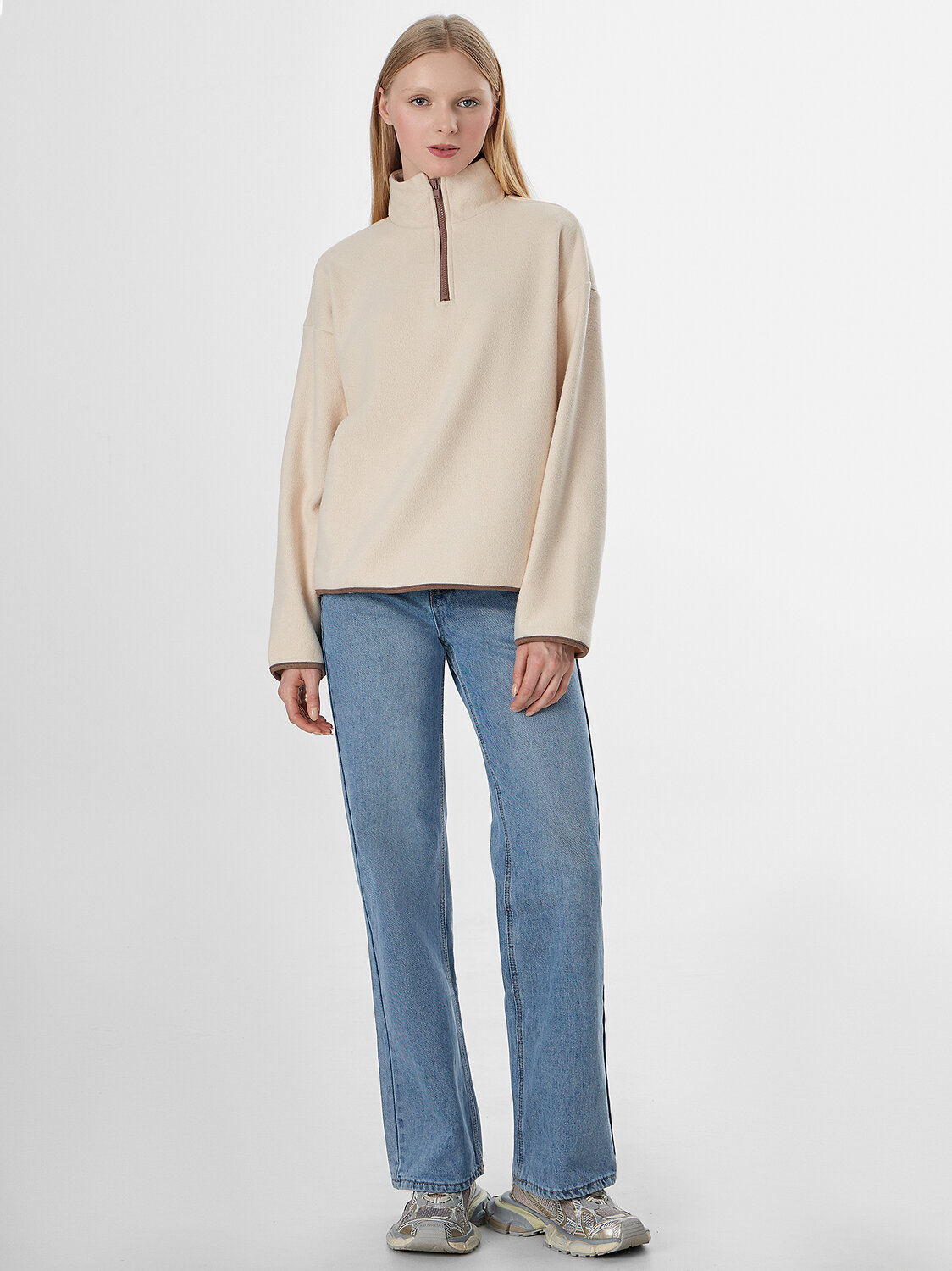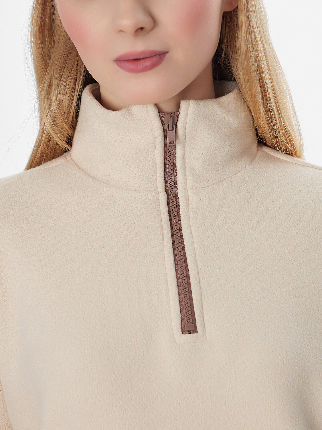 Женская толстовка из мягкого флиса станет уютным дополнением вашего гардероба. Свободный крой с круглой горловиной и стойкой обеспечивает комфорт в течение всего дня. Застежка-молния по центру и мягкие спущенные плечи создают расслабленный силуэт, не сковывающий движений.