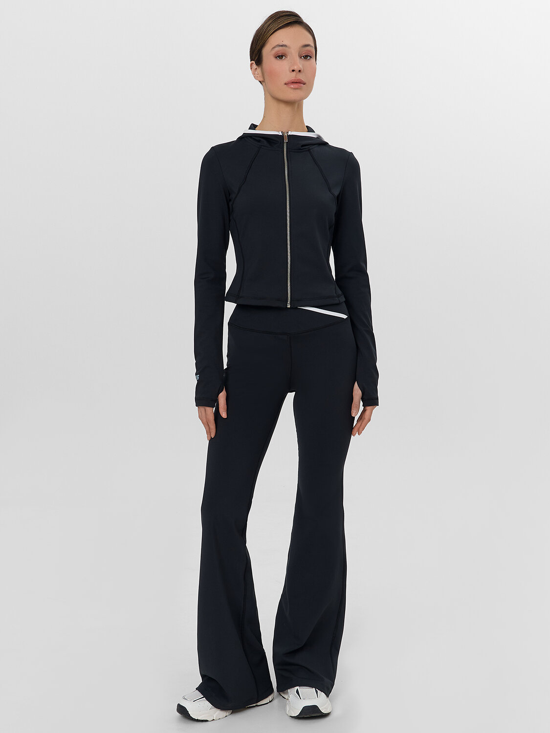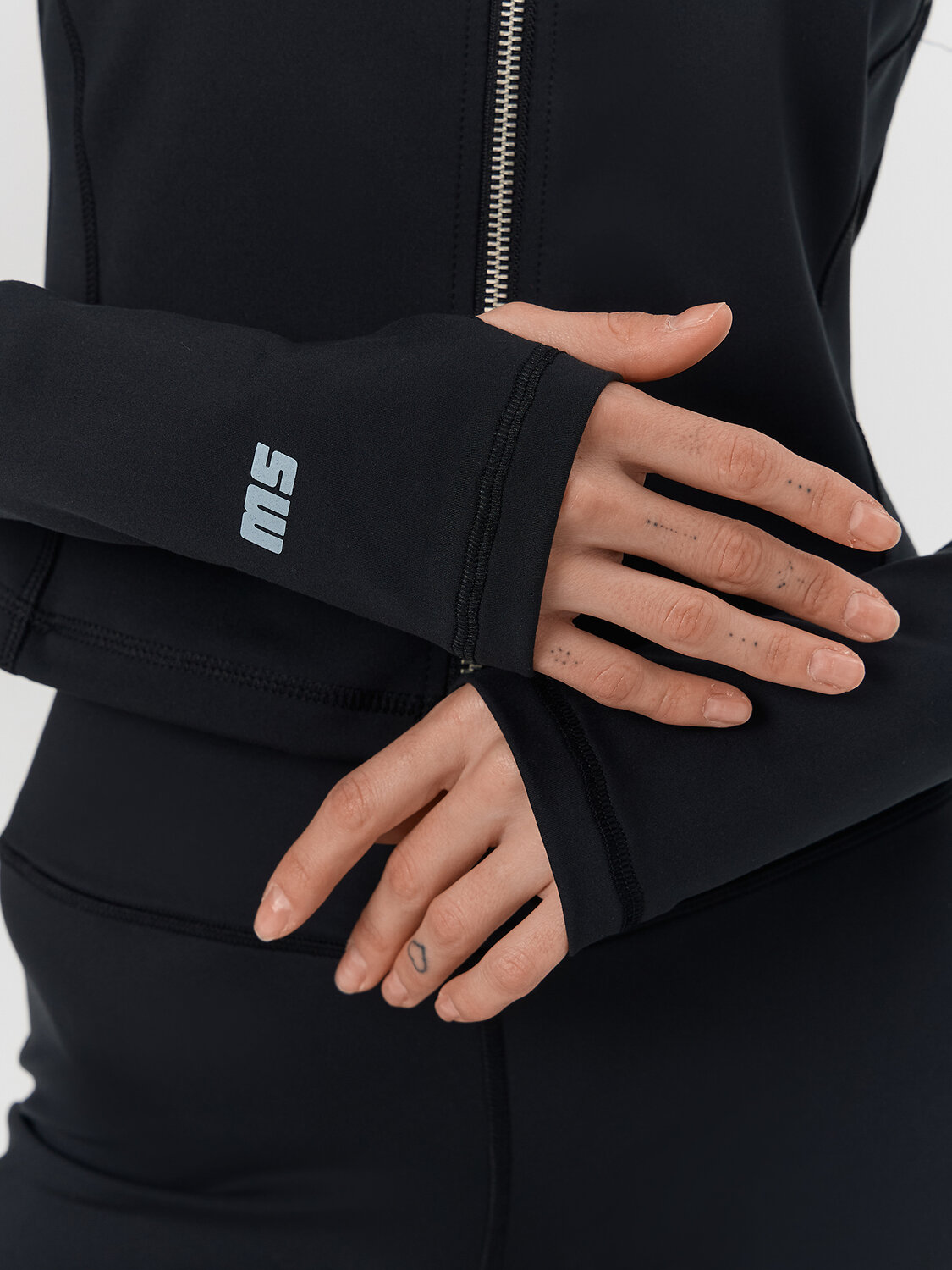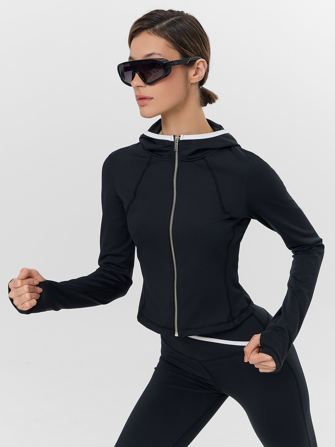 Толстовка на молнии с капюшоном создана для активного образа жизни. Укороченная модель прилегающего силуэта с длинными рукавами обеспечивает полную свободу движений во время тренировок. Специальные разрезы в швах рукавов позволяют фиксировать ткань при помощи большого пальца, что особенно удобно при физических нагрузках.