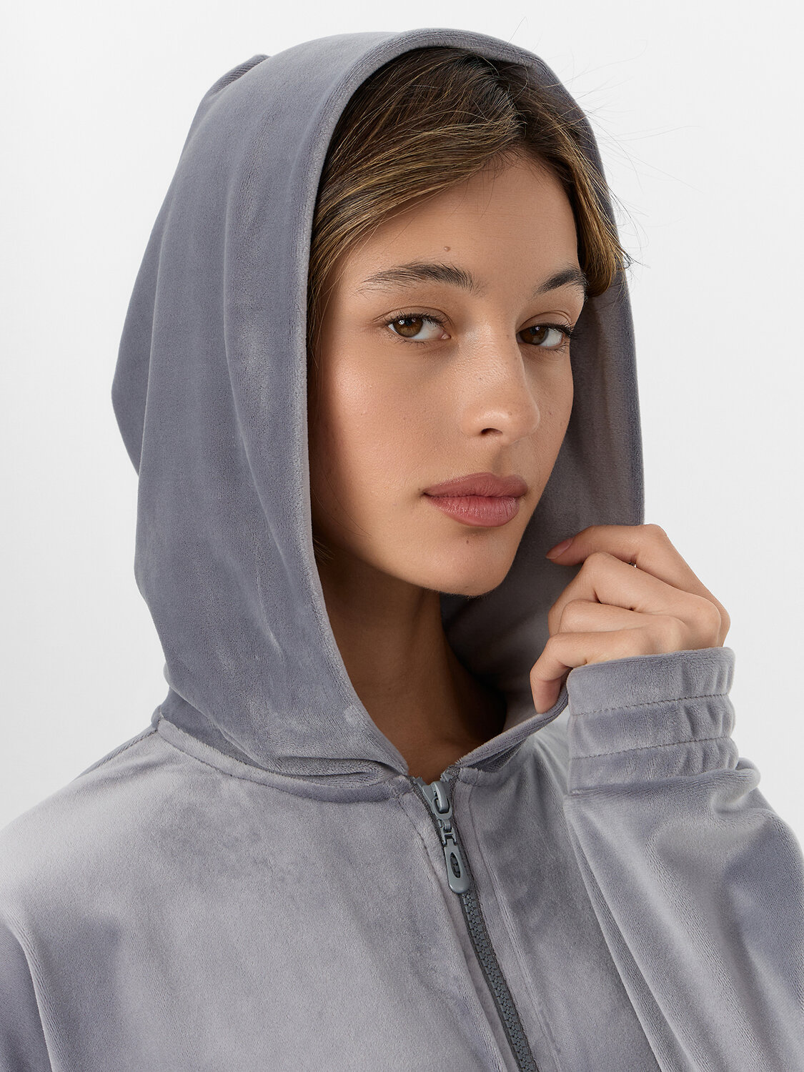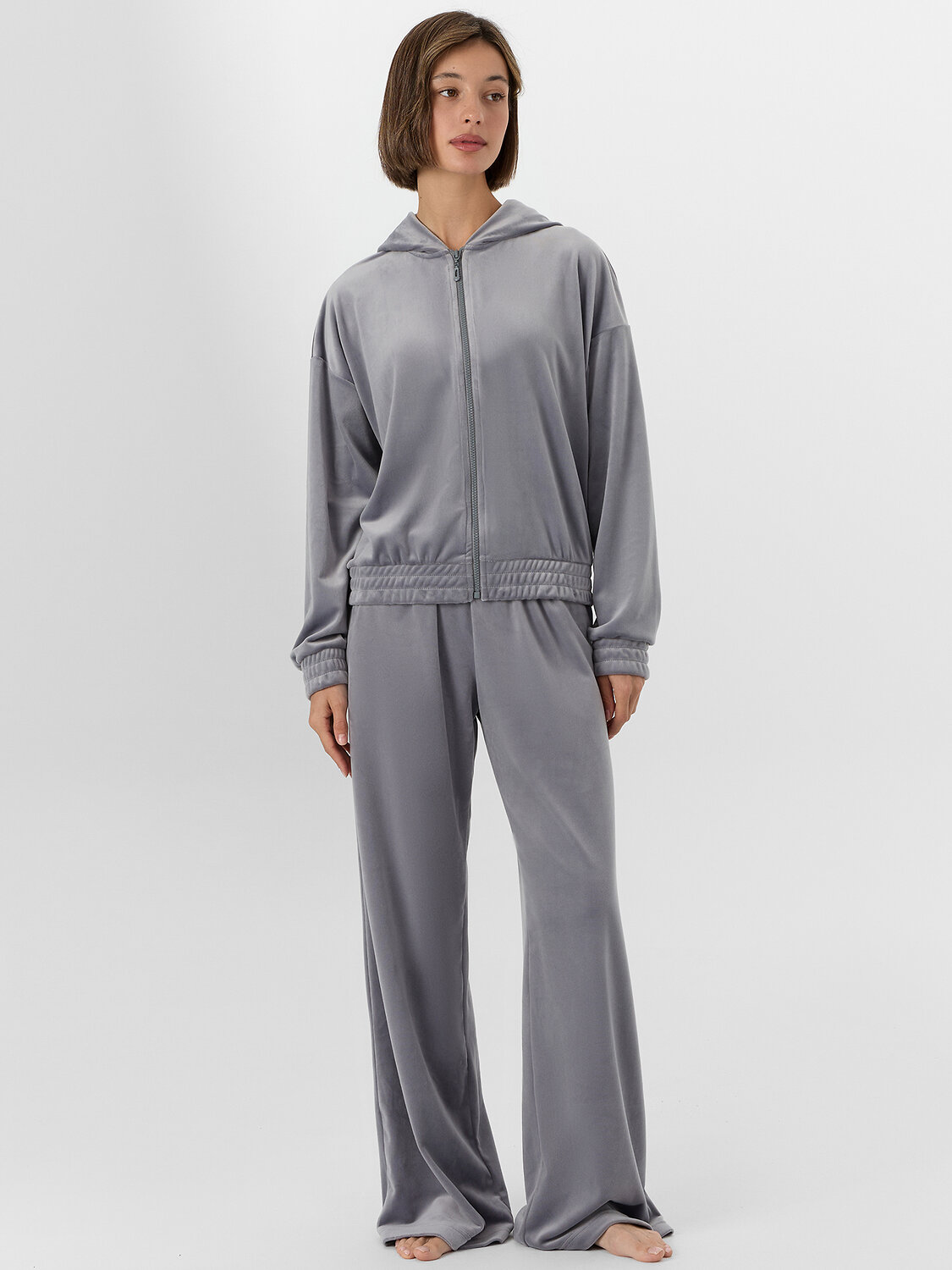 Манжеты на рукавах и пояс по низу, дополненные декоративными строчками, обеспечивают аккуратную посадку. Внутренние швы горловины обработаны мягкой хлопковой тесьмой для приятных тактильных ощущений. Велюровый материал с добавлением эластана мягко тянется и дарит нежность при каждом движении. Эта толстовка станет любимым предметом гардероба для спокойных вечеров и утреннего отдыха.