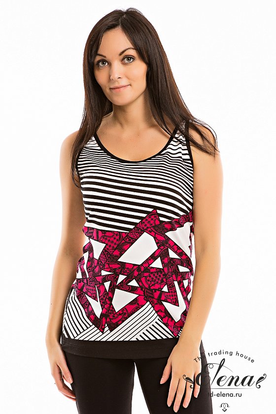 Майка выполнена из вискозного полотна с набивным рисунком. Горловина и проймы изделия обработаны бейкой контрастного цвета.