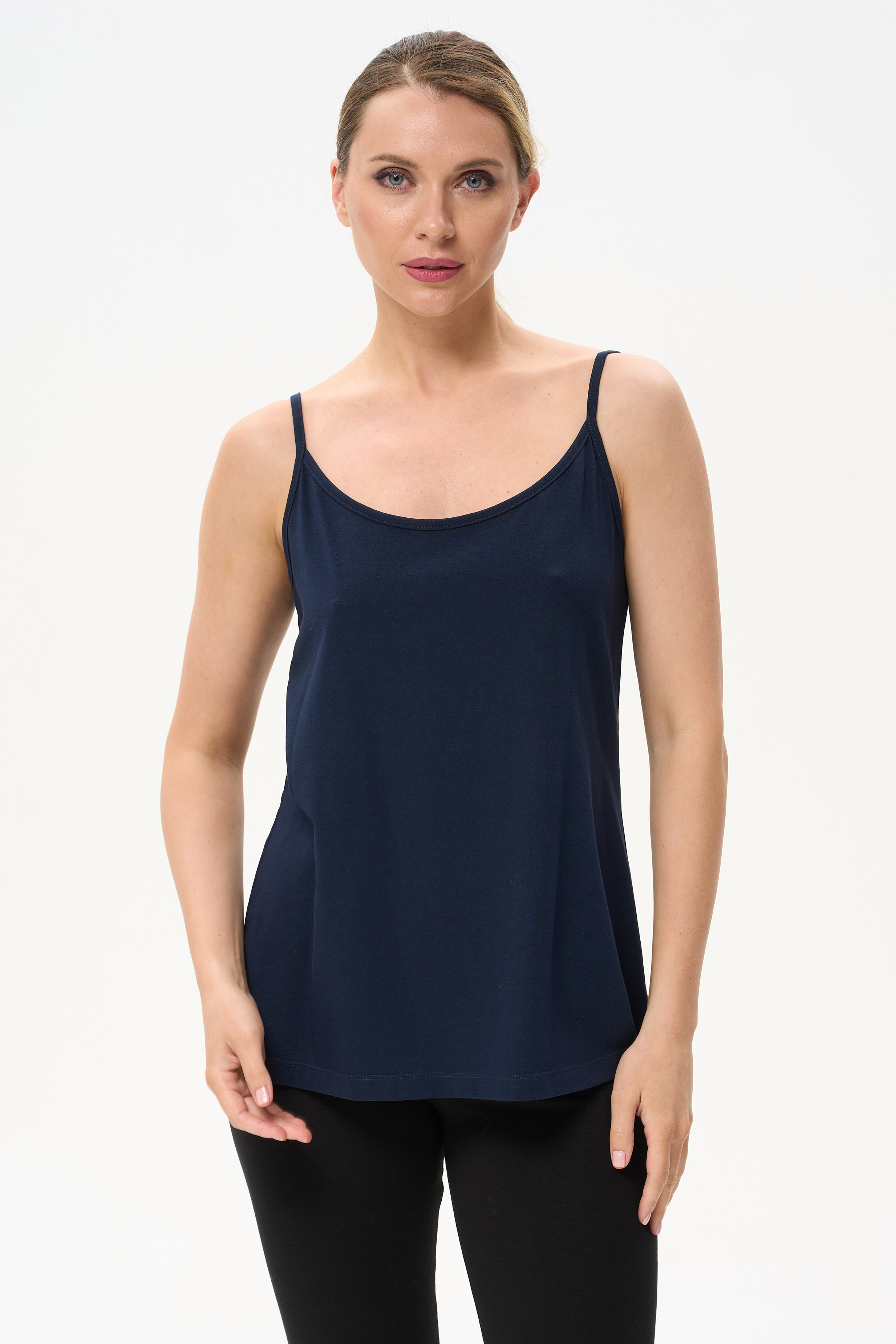 92% хлопок, 8% эластан Майка на тонких бретелях из хлопкового трикотажного полотна с эластаном. Рост модели на фото 170см.