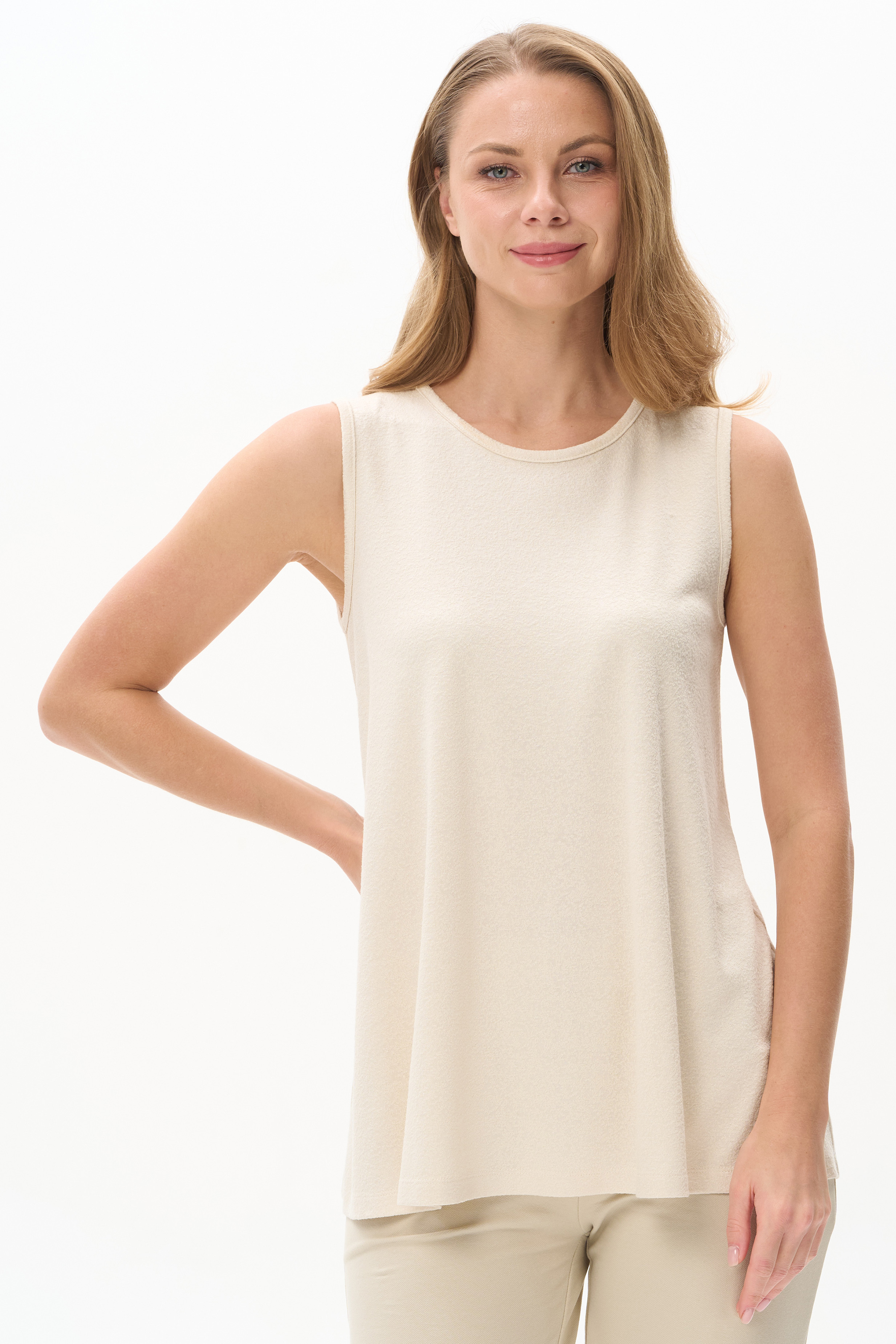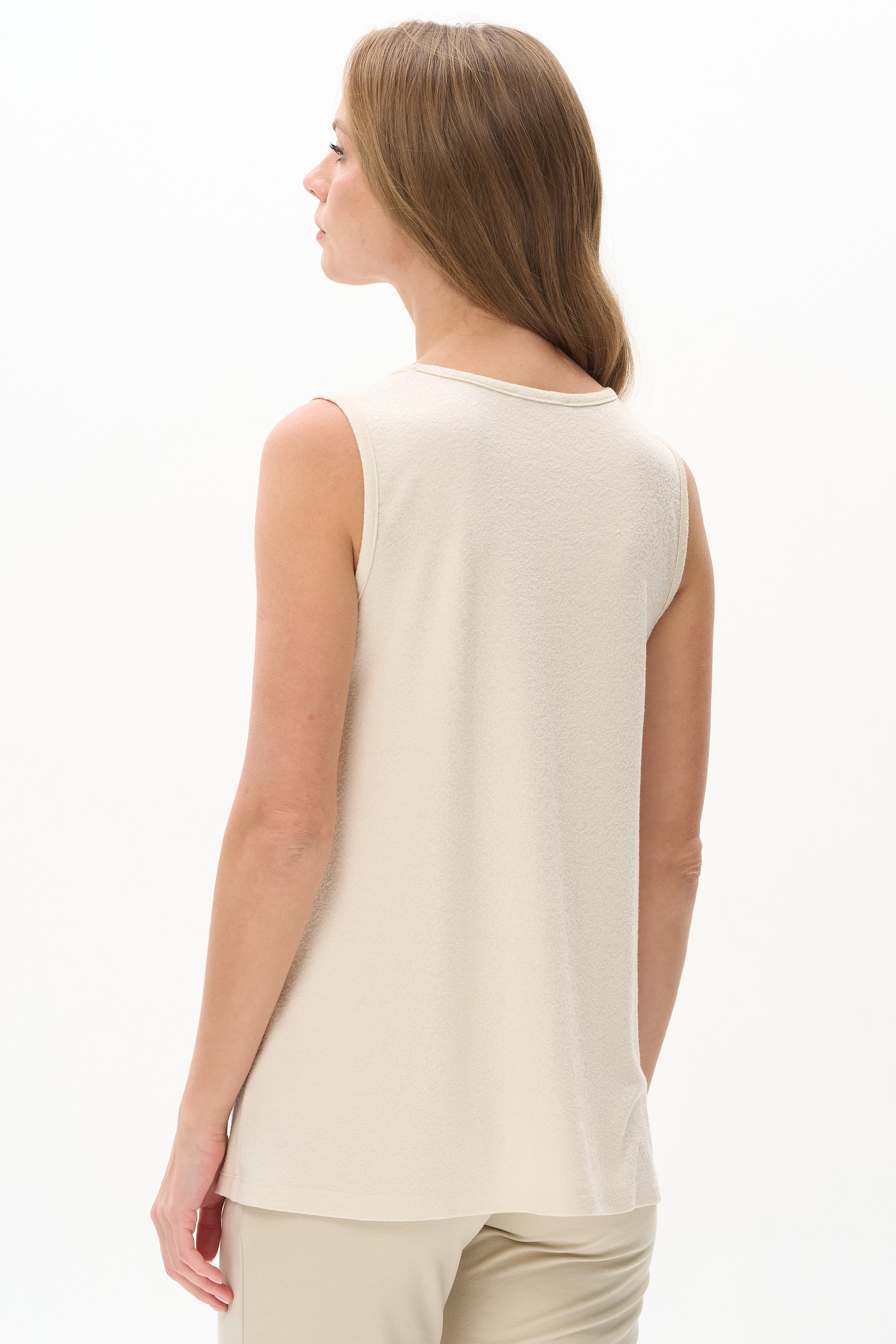 Топ из вискозного жаккардового трикотажного полотна. Круглый вырез горловины, без рукавов. Рост модели 175 см.