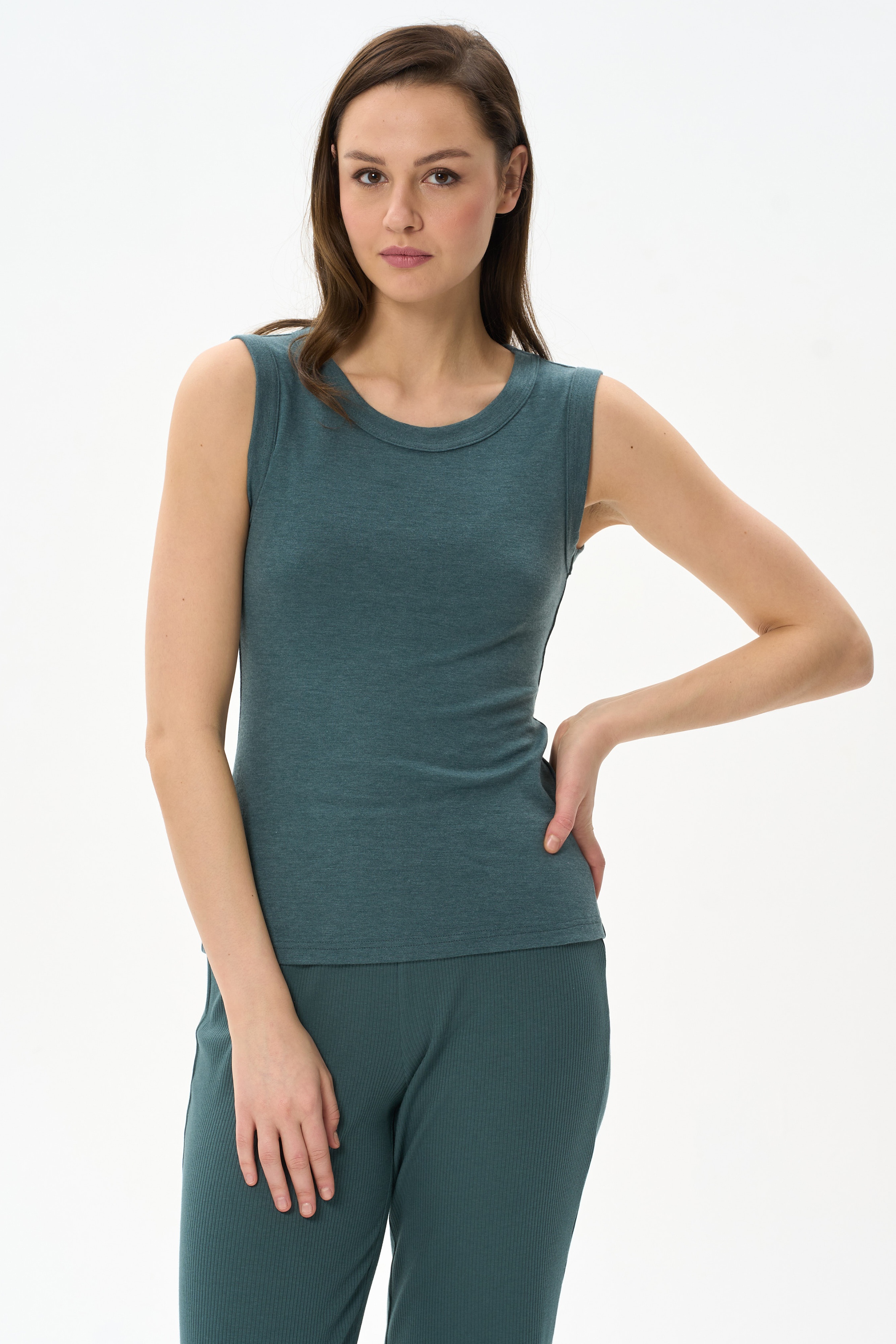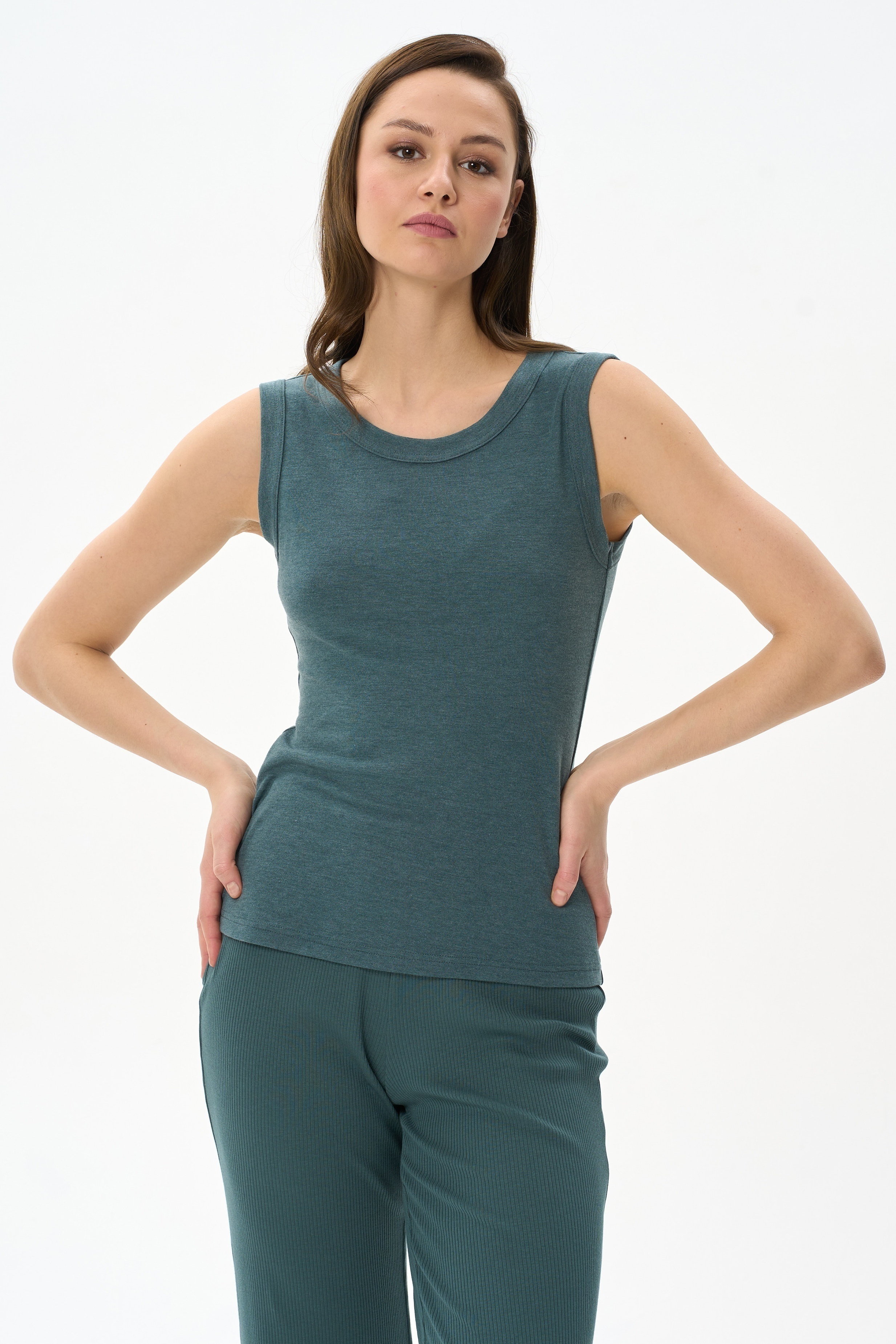 65% вискоза, 27% полиэстер, 8% эластан Топ выполнен из вискозного трикотажного полотна - рибана. Модного прилегающего силуэта. Круглый вырез горловины и завышенные проймы обработаны широкой планкой. Рост модели на фото 178см.