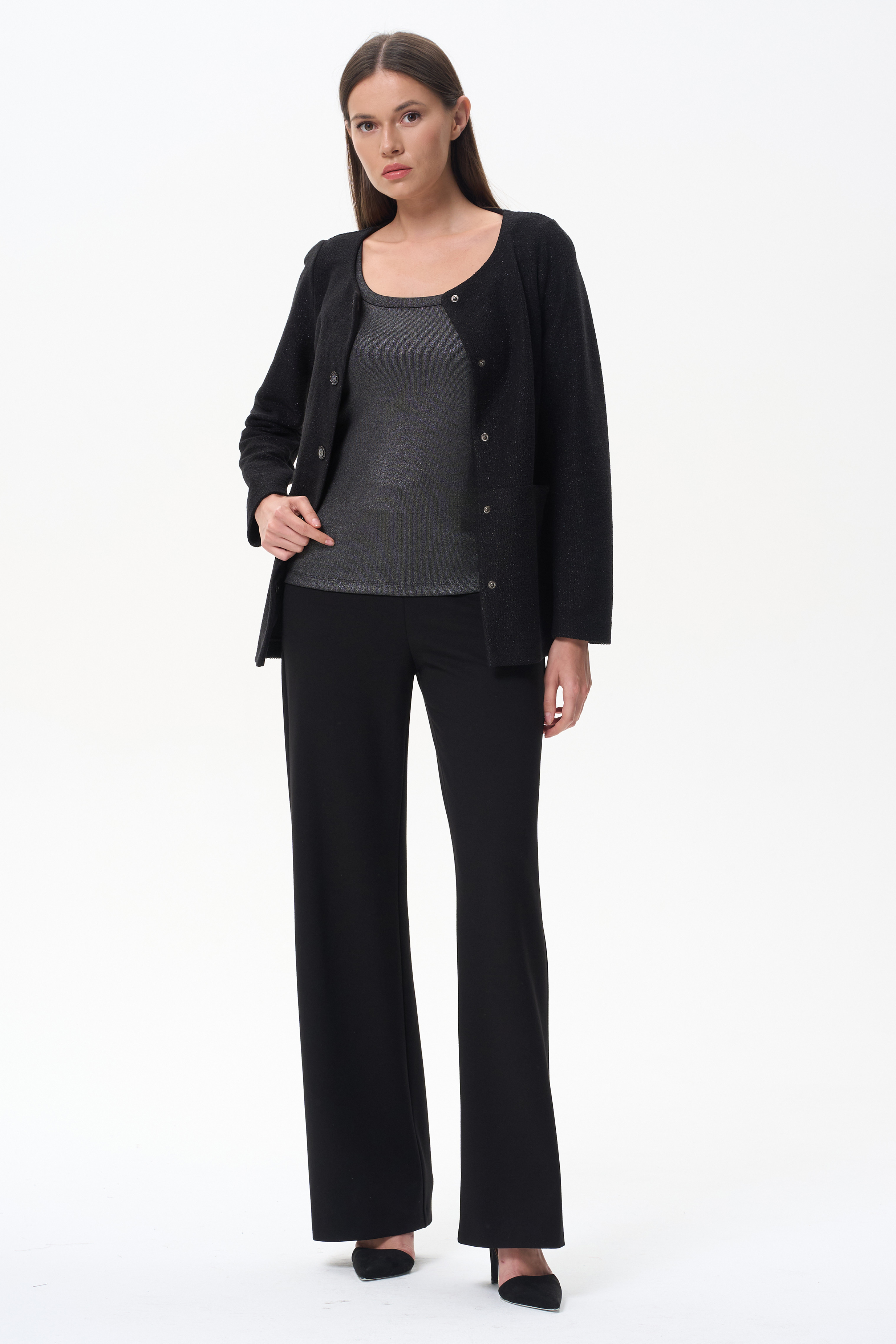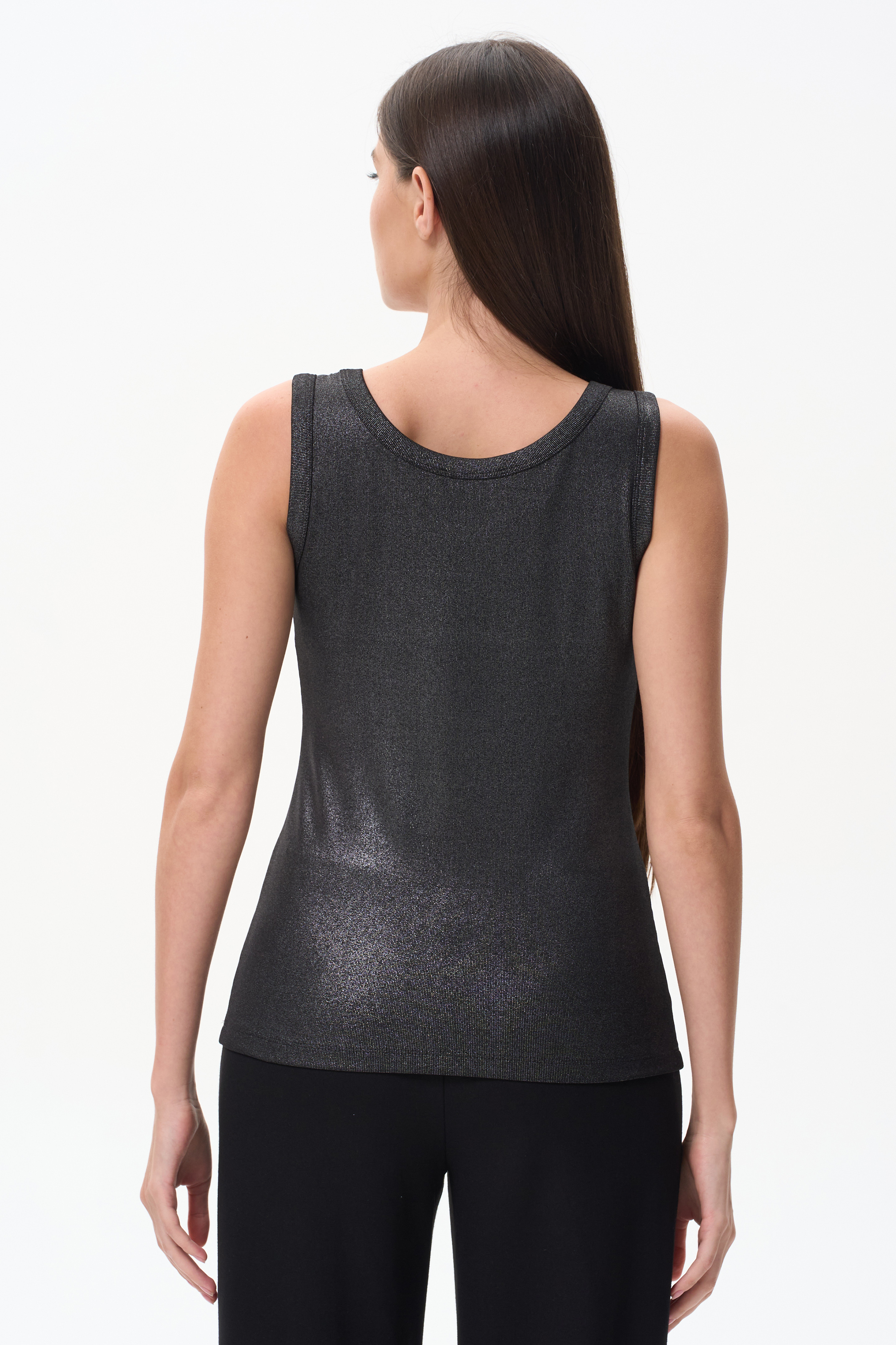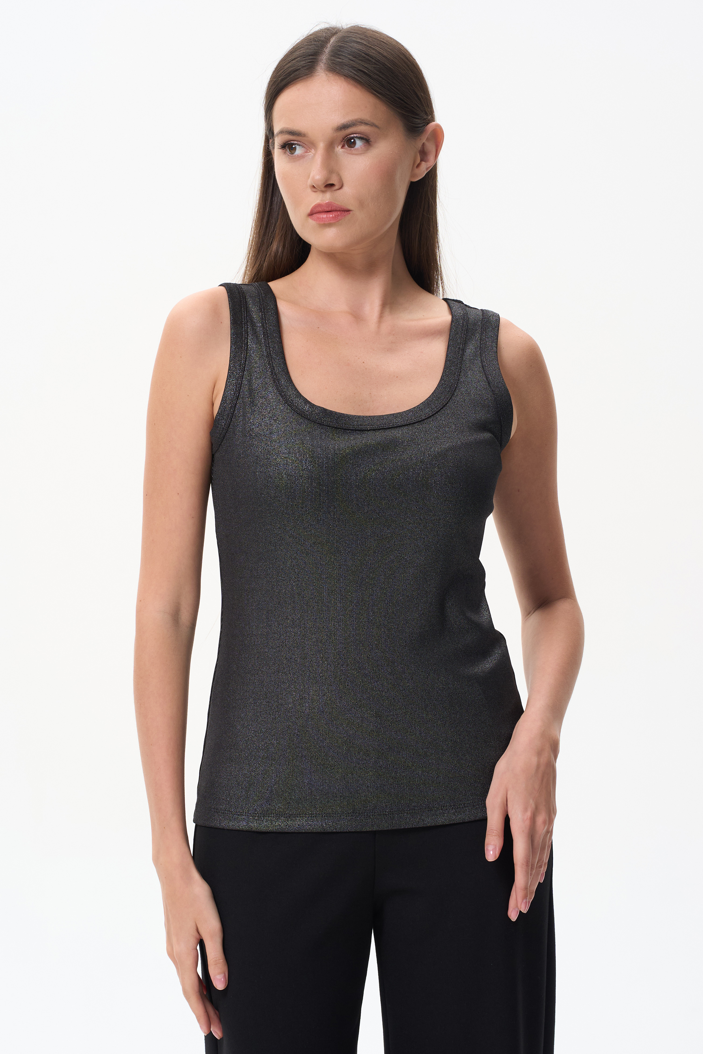 70% вискоза, 25% полиэстер, 5% эластан Нарядная майка из кашкорсе с серебристым покрытием 250 гр. Удобные широкие бретели, комфортная посадка, блестящая поверхность для эффектных образов. Майка с благородным блеском лицевой стороны и мягкой гладкой изнаночной стороной, невороятно привлекательна и комфортна. Рост модели 175 см.