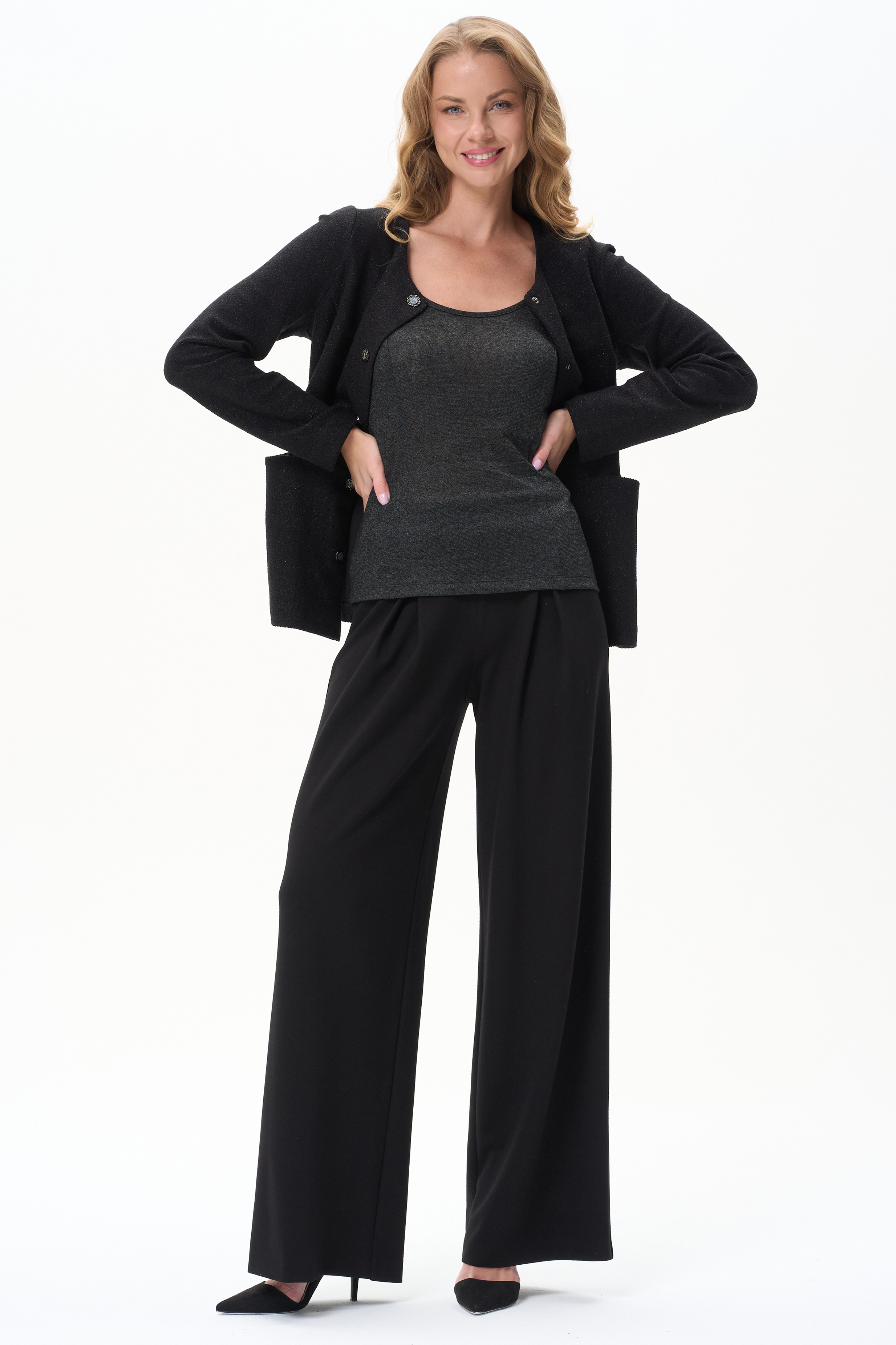 Майка из трикотажного полотна с серебристым блеском, на тонких бетелях для создания элегантных образов.