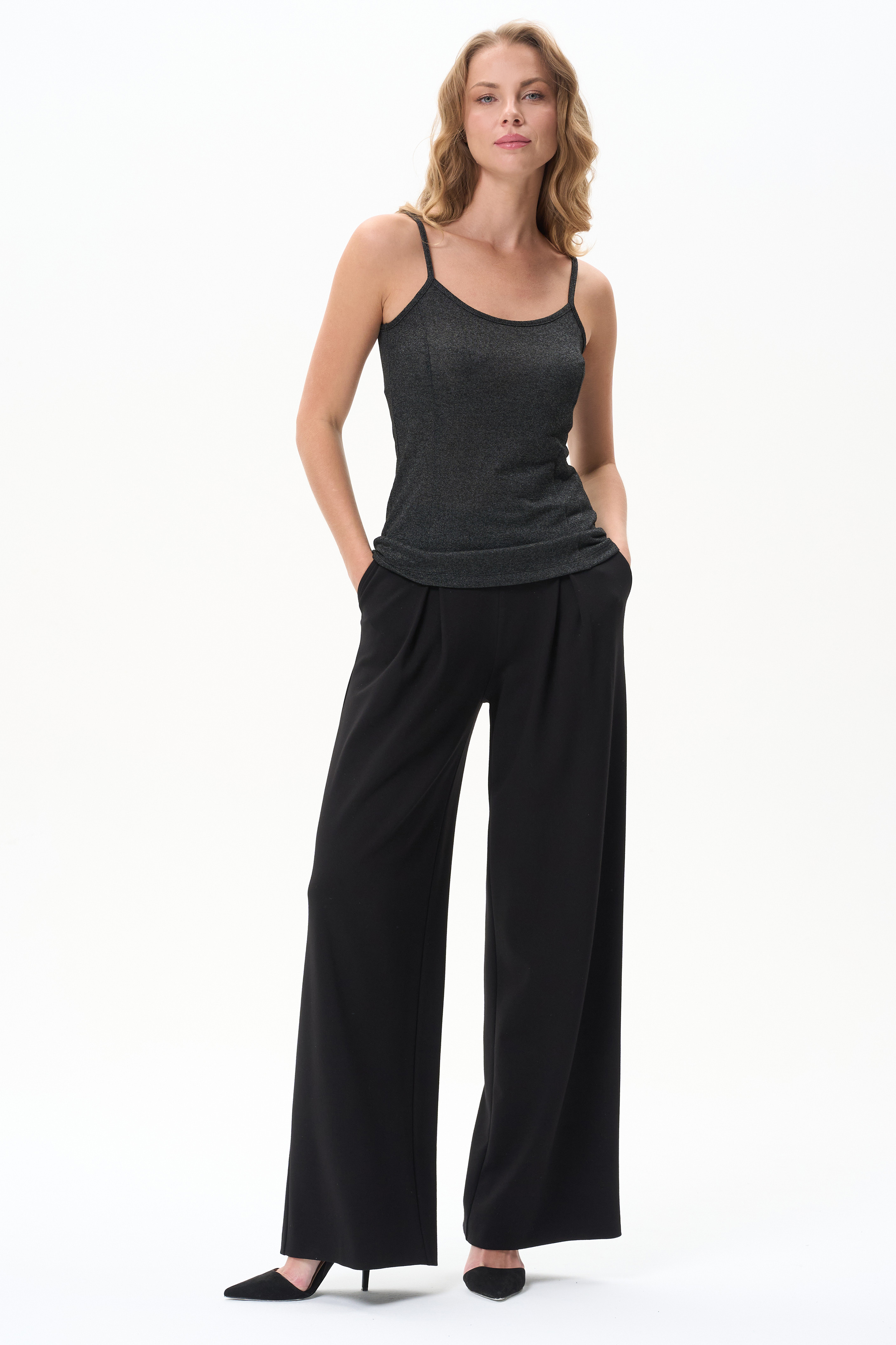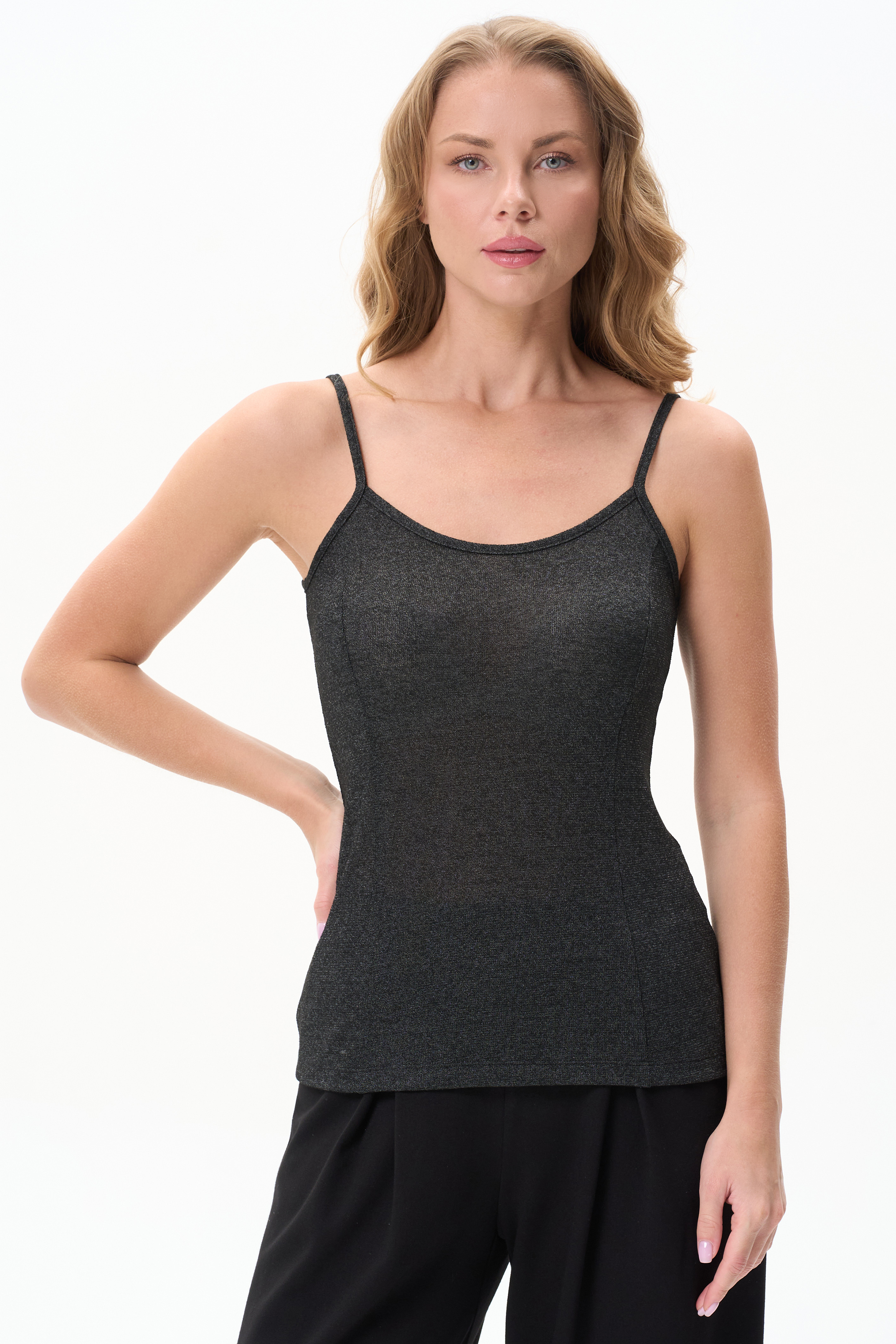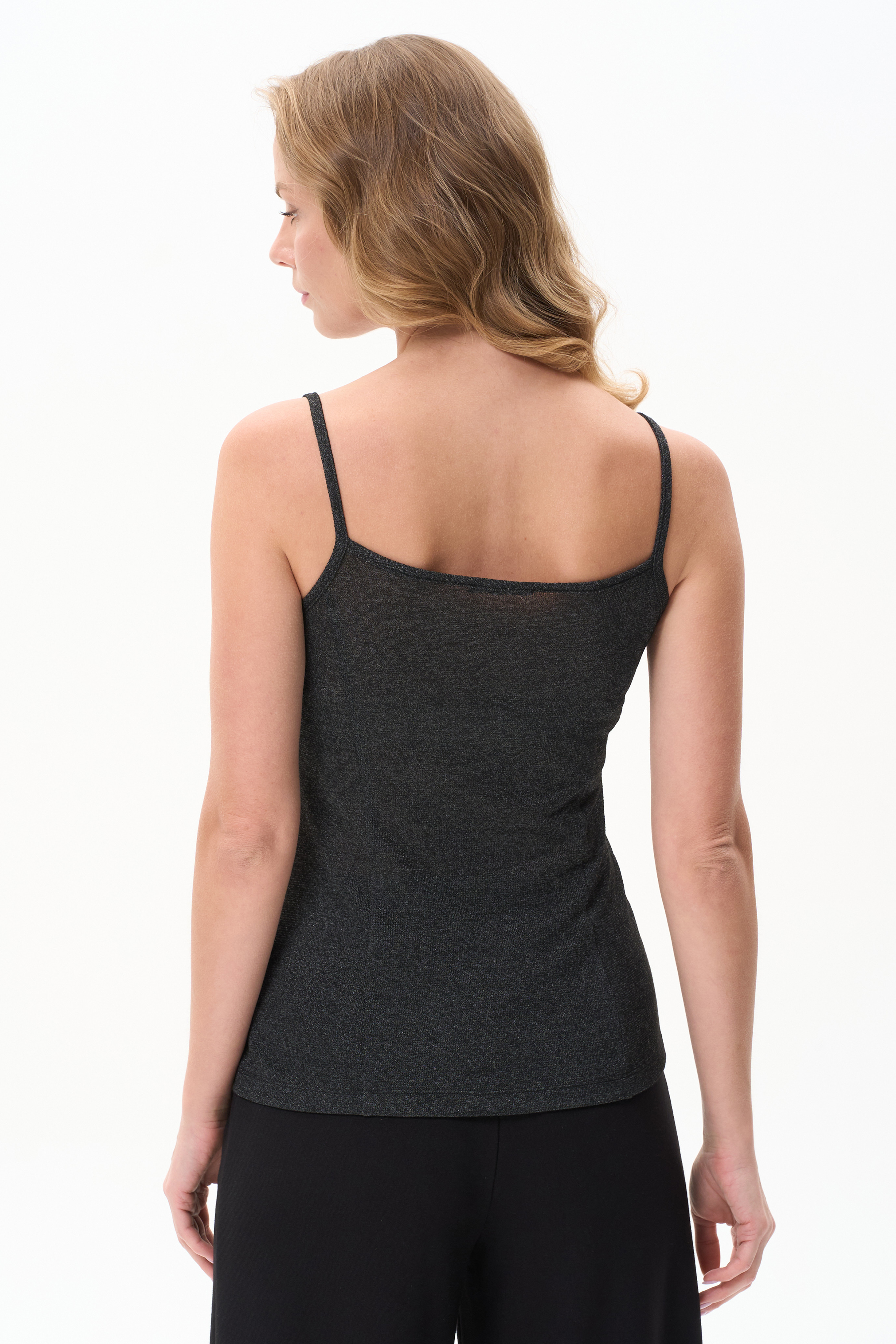 70% вискоза, 28% полиэстер, 2% эластан Майка из трикотажного полотна с серебристым блеском, на тонких бетелях для создания элегантных образов.