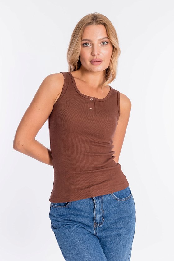 Майка женская на широких бретелях, с круглым вырезом горловины. Силуэт облегающий, майка выполнена из полотна в рубчик (кашкорсе-вискоза), спереди планка на кнопках.