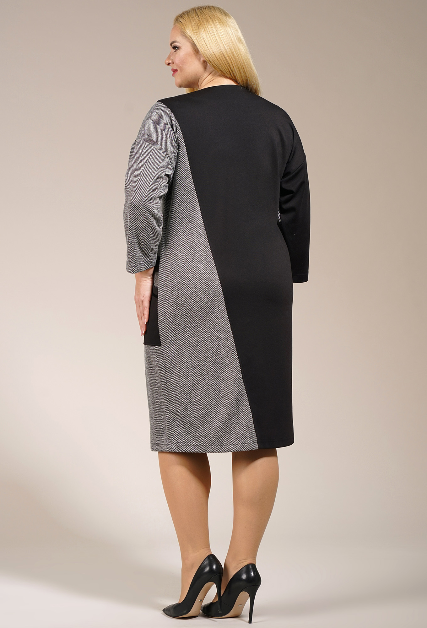 Платье полуприлегающего силуэта обыграно ассиметричными вставками из материала-однотонна со спущенной линией плеча.