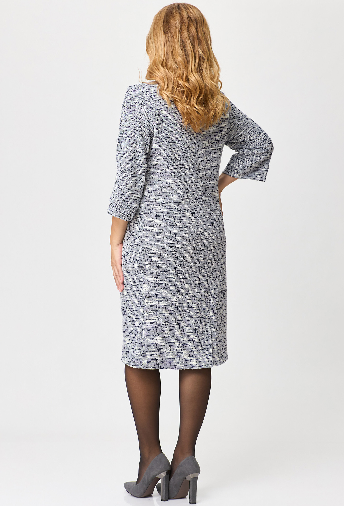 Повседневное платье выполнено из трикотажа с ненавязчивым блеском. Простой прямой крой изделия подчеркнет все достоинства и скроет изъяны Вашей фигуры. Рукав 3/4, втачной с притачной манжетой по низу. Горловина изделия округлая на молнии несущей больше декоративный характер. По переду имеются функциональные накладные карманы, сзади шлица.