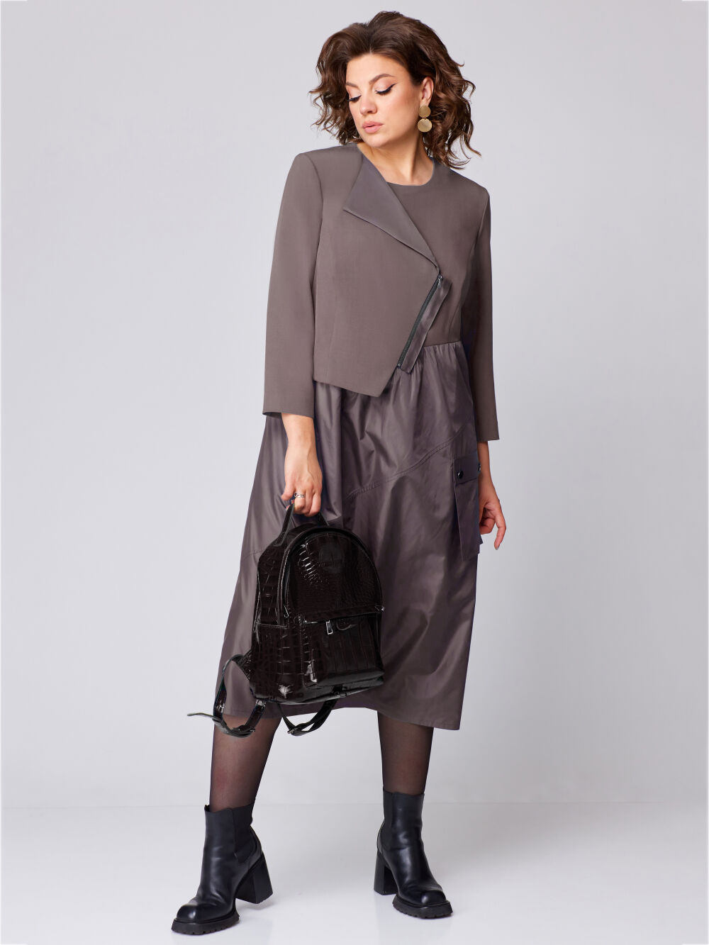 Платье женское  А- силуэта. Рукав втачной, двухшовный. По переду отлетная деталь имитирующая «косуху», с декоративной, не функциональной застежкой – молнией. Горловина округлой формы, воротник апаш из отделочной ткани. По линии талии подрез. Нижняя часть платья  со сборкой, на подкладке. Выполнена из отделочной ткани с отстрочными швами, накладным карманом с клапаном на две петли и пуговицы. Карман функциональный. Спинка со средним швом, отрезная по линии талии, со сборкой из отделочной ткани. В верхней части спинки потайная молния. Длина изделия по спинке 115см. Длина рукава 52см.