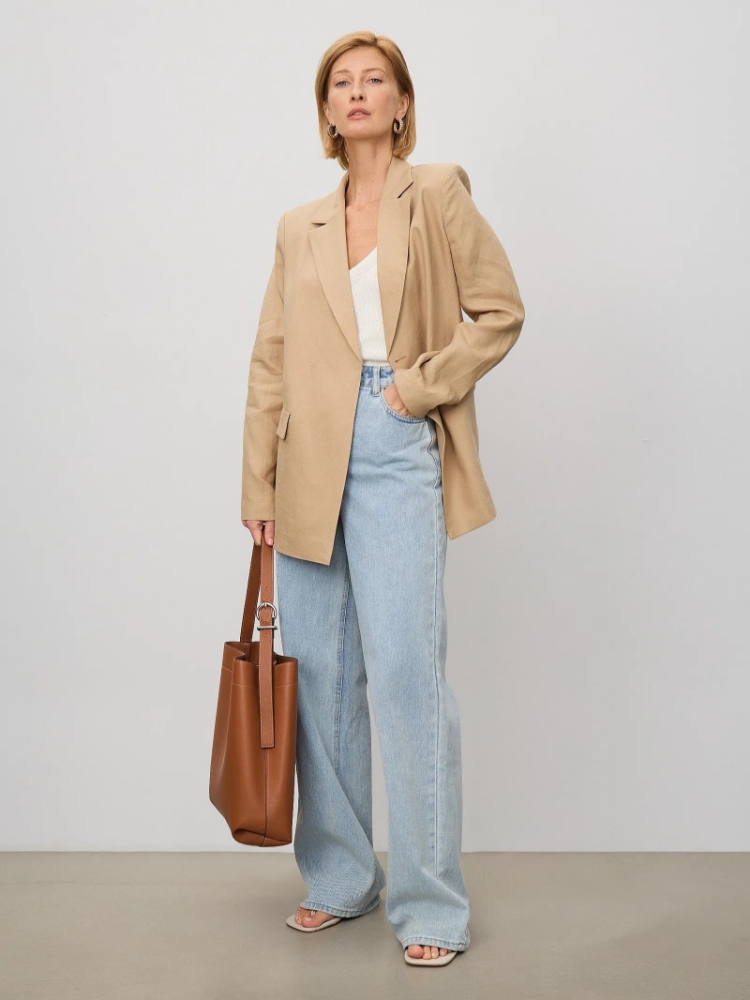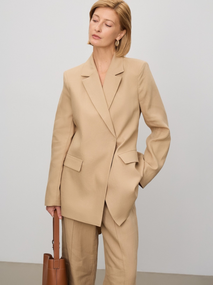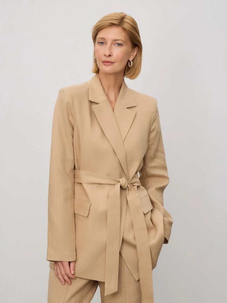 Элегантный льняной жакет со стильной асимметрией и потайными пуговицами интригует необычным дизайном. Ещё одно его важное достоинство — универсальность. Такая вещь будет органично смотреться и в офисе, и в неформальной обстановке. Расслабленности добавляет пояс-кушак, которым можно дополнительно акцентировать талию. А английский воротник и карманы с клапанами приближают к деловому стилю. Полуприталенная удлинённая модель не сковывает движения и хорошо садится на любую фигуру. Изделие с полностью натуральным составом выполнено изо льна на хлопковой подкладке. Незаменимая вещь в функциональном гардеробе на лето