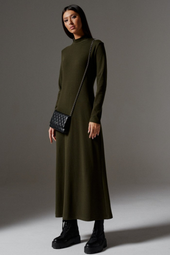 Платье А образного силуэта выполнено из трикотажного полотна в рубчик цвета хаки. Уютное, женственное, универсальное платье лучший вариант осеннего образа.