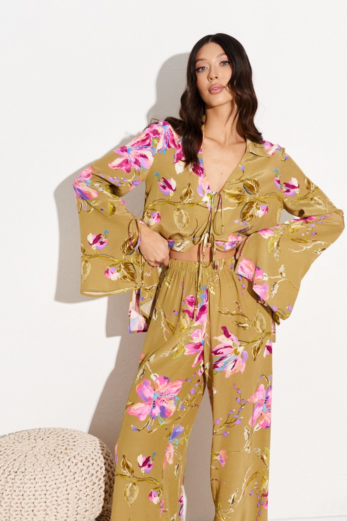 Комплект состоит из рубашки и брюк выполнен из струящегося полотна с цветочным принтом.