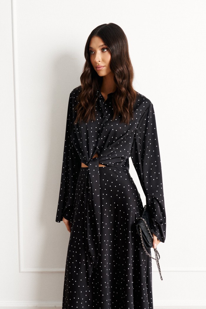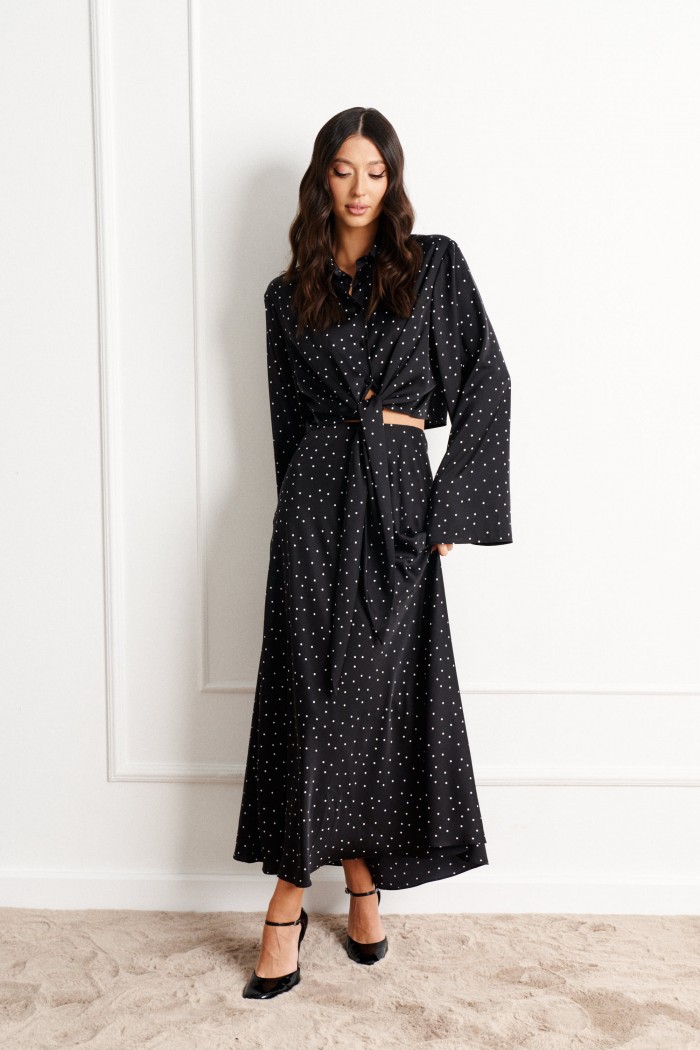 Комплект состоит из рубашки и юбки, выполнен из черного полотна с контрастным принтом - мелкий горох.